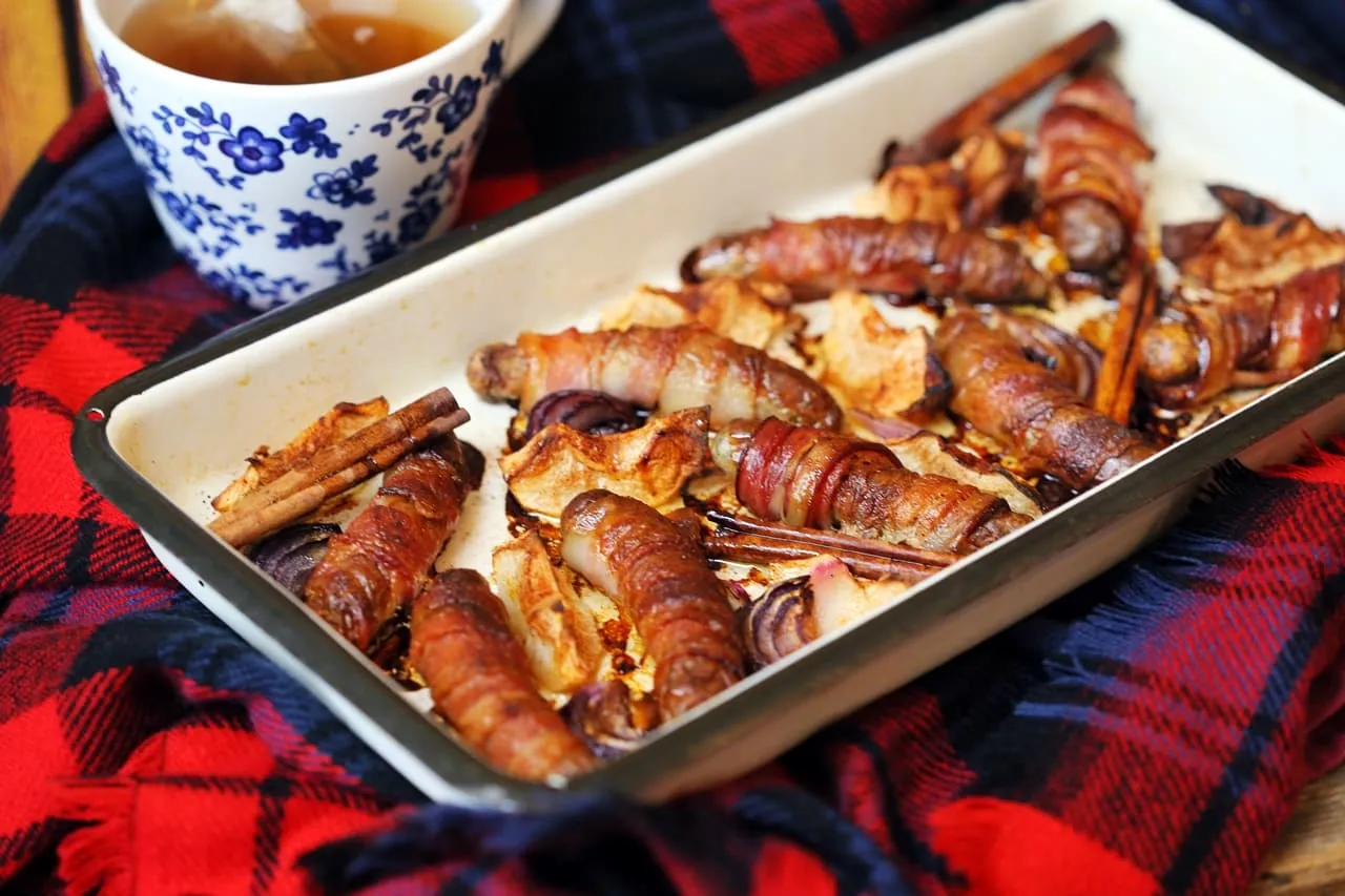 Ha egy nem mindennapi ízvilágú reggelire vágytok és szeretitek a húsos kajákat, akkor ez a ti reggelitek! Baconbe tekert mini kolbászok fahéjjal, almával és hagymával. Higgyétek el, együtt nagyon királyak ezek a dolgok!