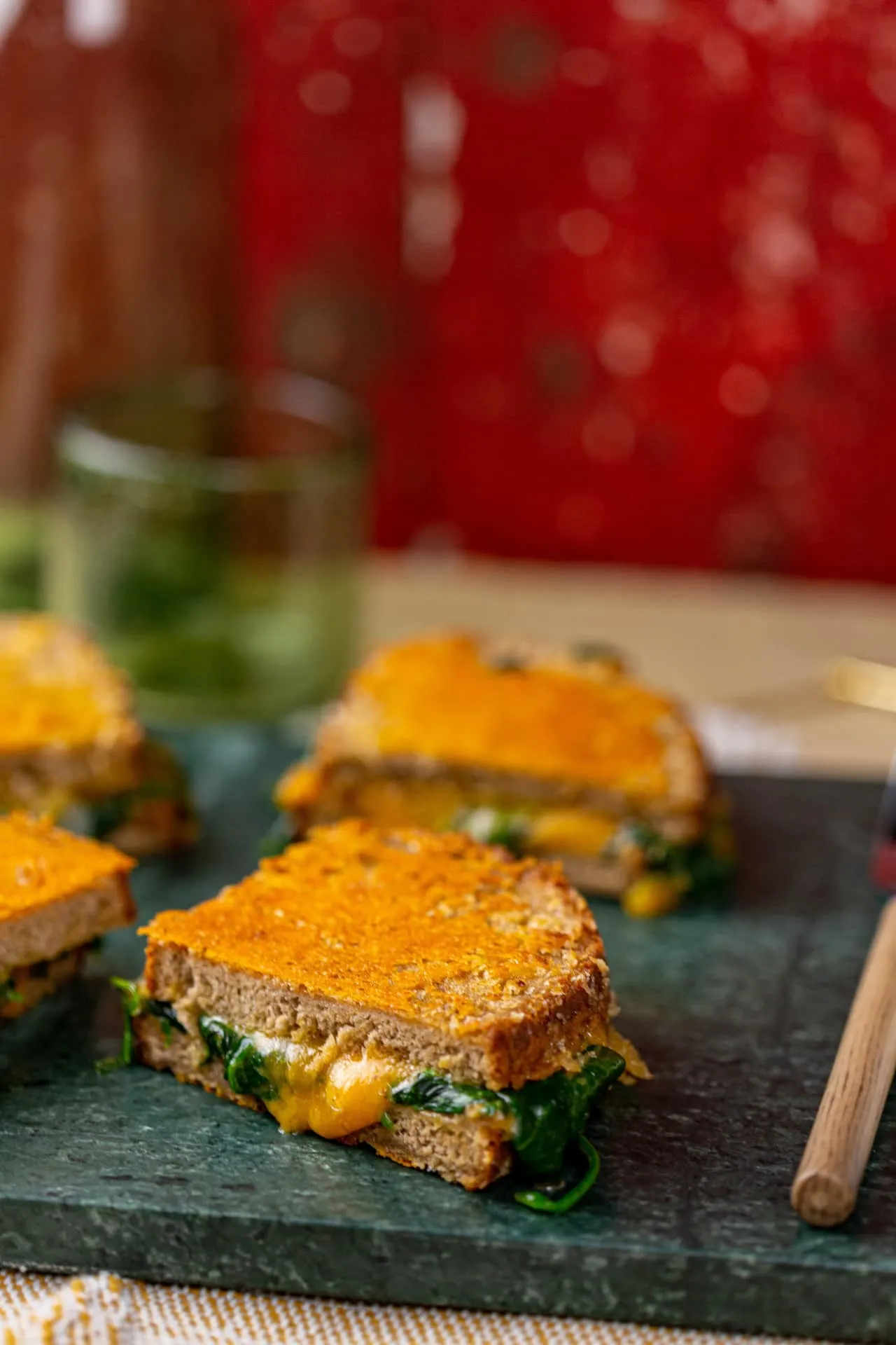 A tejet egy tálban összekeverjük a tojásokkal, sózzuk, borsozzuk, majd ebbe áztatjuk a kenyérszeleteket. A szendvicsekhez két-két szelet közé töltjük a spenótot és a lereszelt cheddart, majd a pankomorzsába forgatjuk őket.