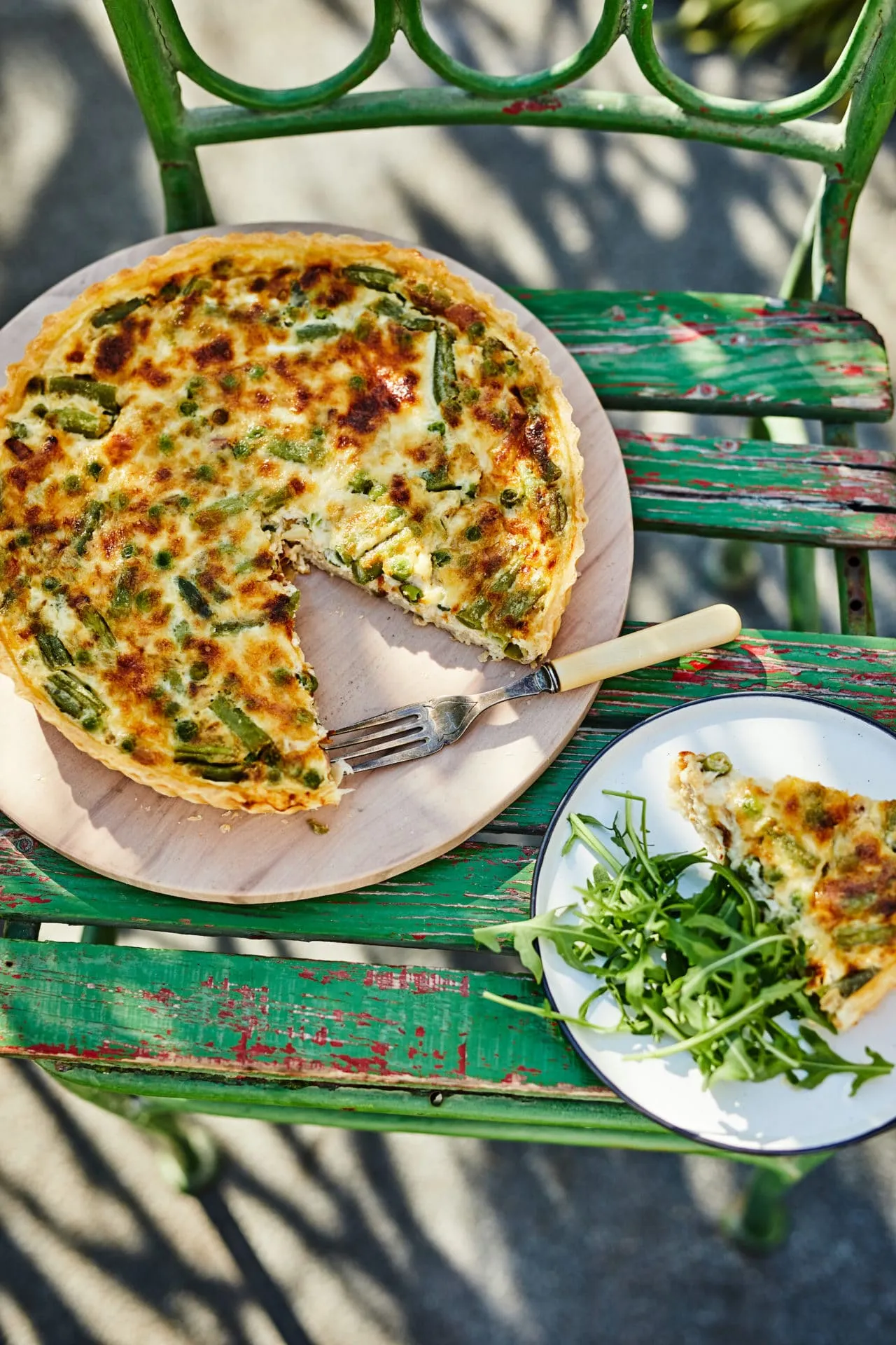 A tojást, a reszelt sajtot és a tejet összekeverjük. A piteformába nyomkodjuk a leveles tésztát, egy villával megszurkáljuk a tetejét, és 180 fokra előmelegített sütőben 3 percig sütjük, majd kivesszük. Ekkor mehet rá a zöldség, majd a tojásos keverék. Visszatesszük 25 percre, majd feljebb kapcsoljuk a sütőt 200 fokra, és további 10 percig sütjük. Friss rukkolával tálaljuk.