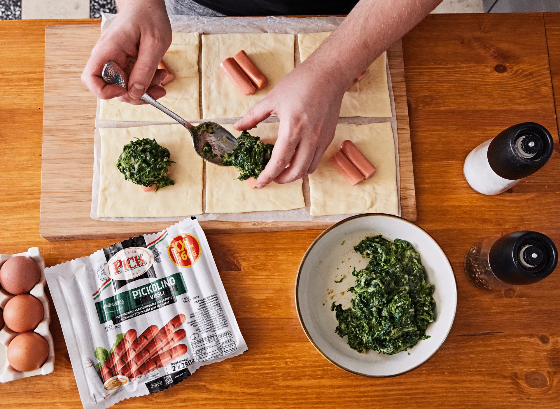A tészta közepére rakunk 2 virslit, erre egy nagyobb evőkanálnyi spenótos keveréket, majd a tészta széleit, átlósan összecsípjük középen, és sütőpapírral bélelt tepsire tesszük a batyukat. Lekenjük tojással, és 200 fokra előmelegített sütőben 12-15 perc alatt megsütjük.