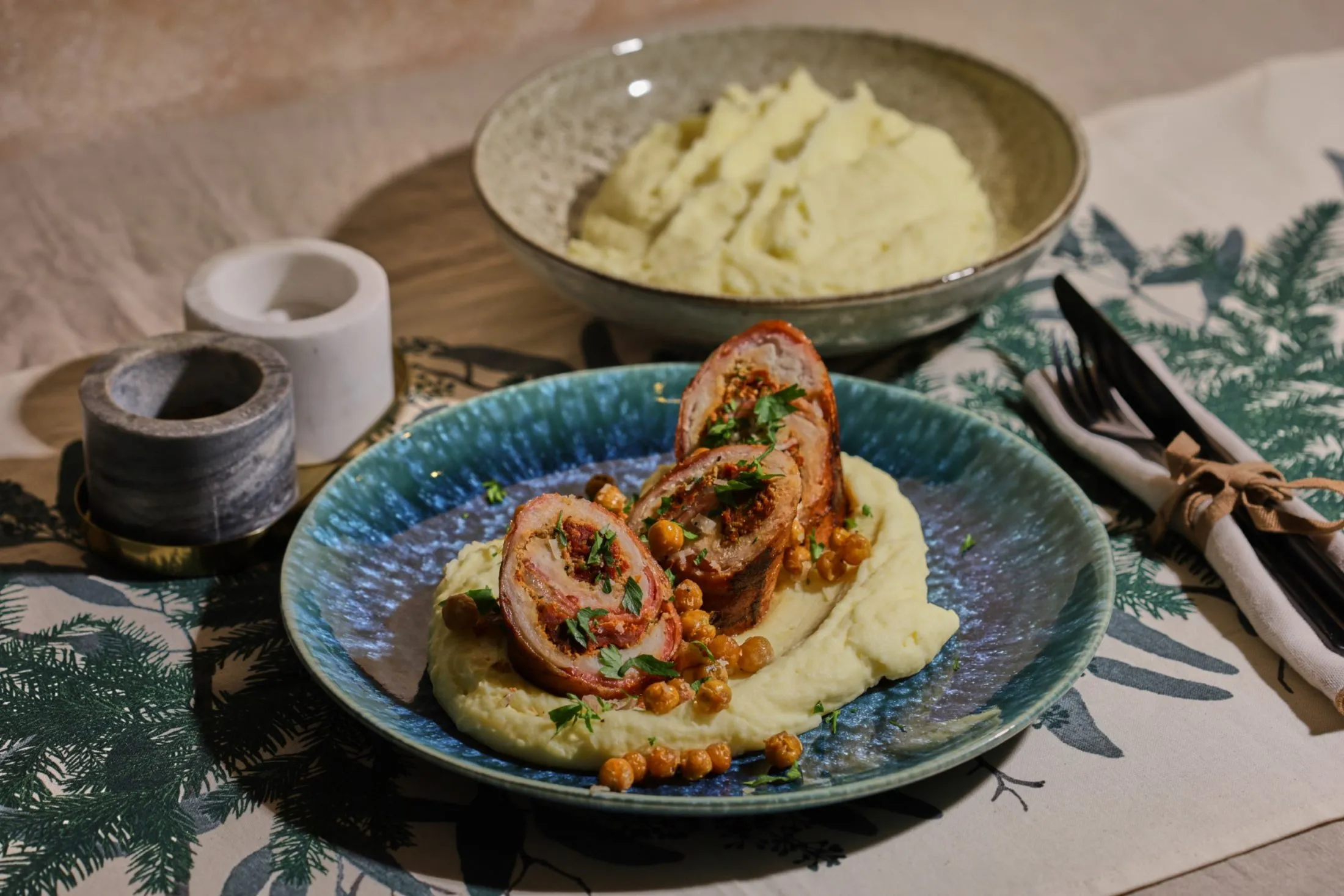 Tányérra szedjük a krumplipürét, rátesszük a felszeletelt húst, rászórjuk a csicseriborsót és a friss, felaprított petrezselymet is.