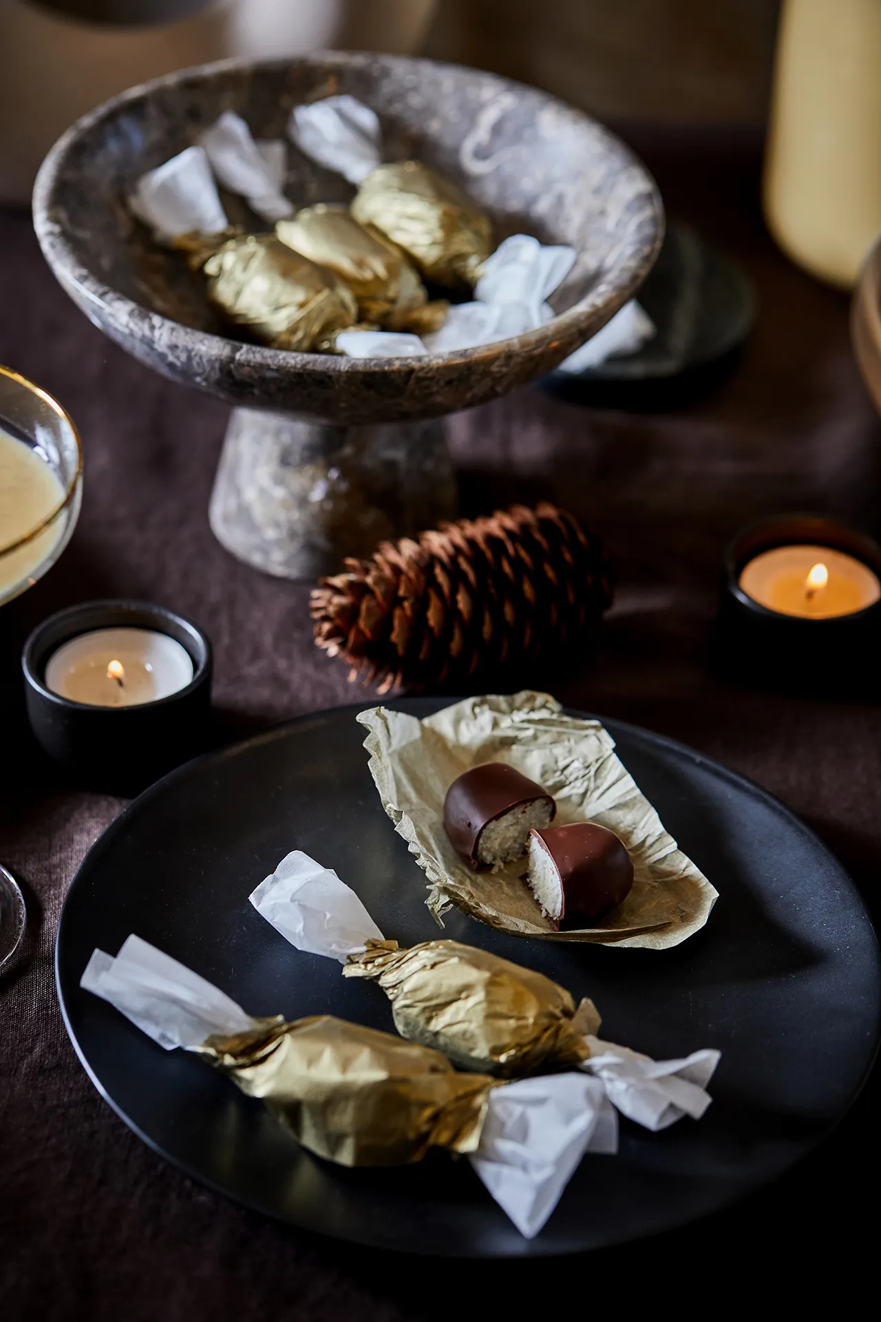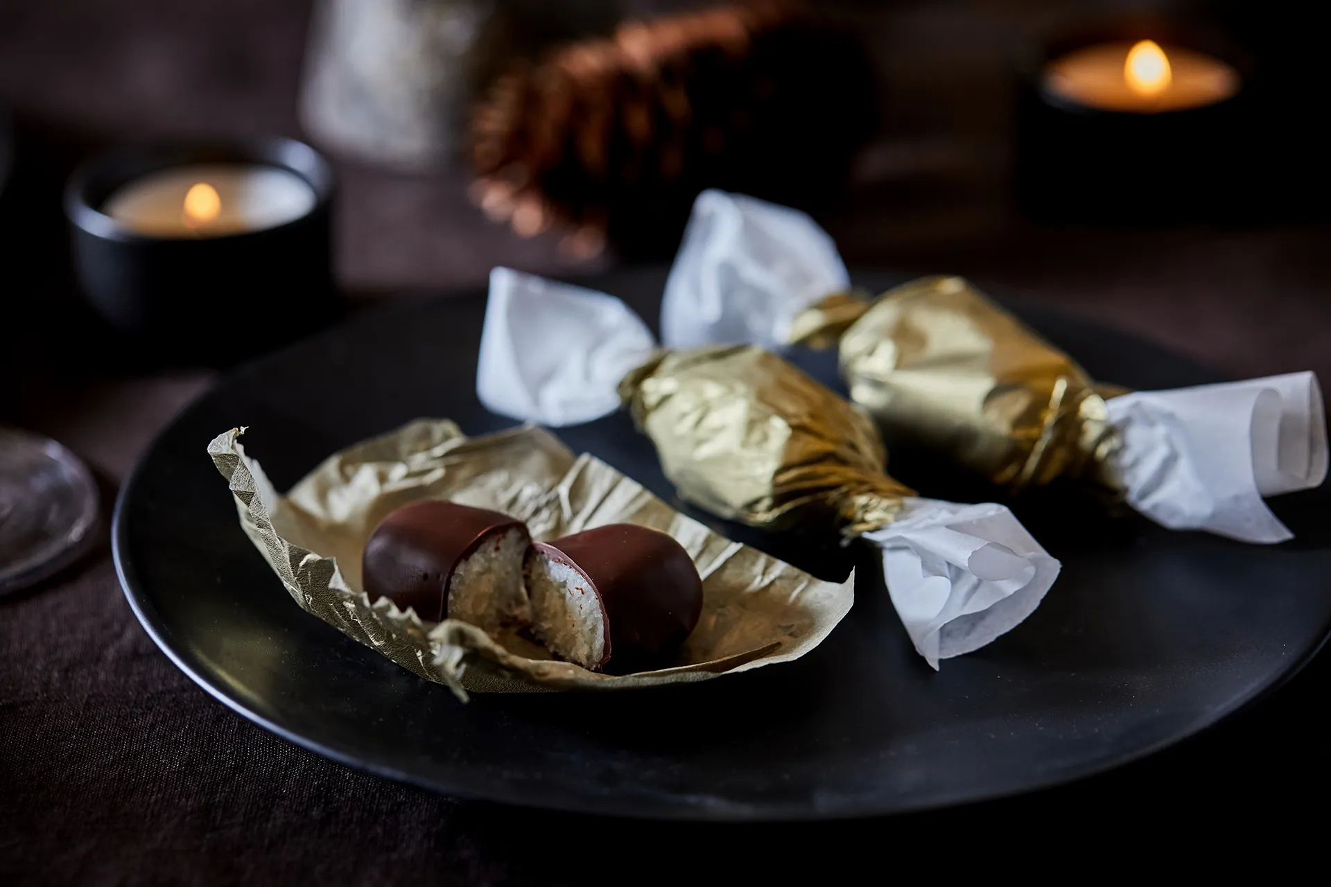 A keveréket 40 db, 15 g-os kis gombócra osztjuk, majd enyhén vizezett kézzel megformázzuk a már jól ismert szaloncukor alakúra. Ha biztosra akarunk menni, ezt bedobjuk 30-40 percre a fagyasztóba, és közben felteszünk egy kis lábasban vagy gyorsforralóban vizet melegíteni a csokiolvasztáshoz.