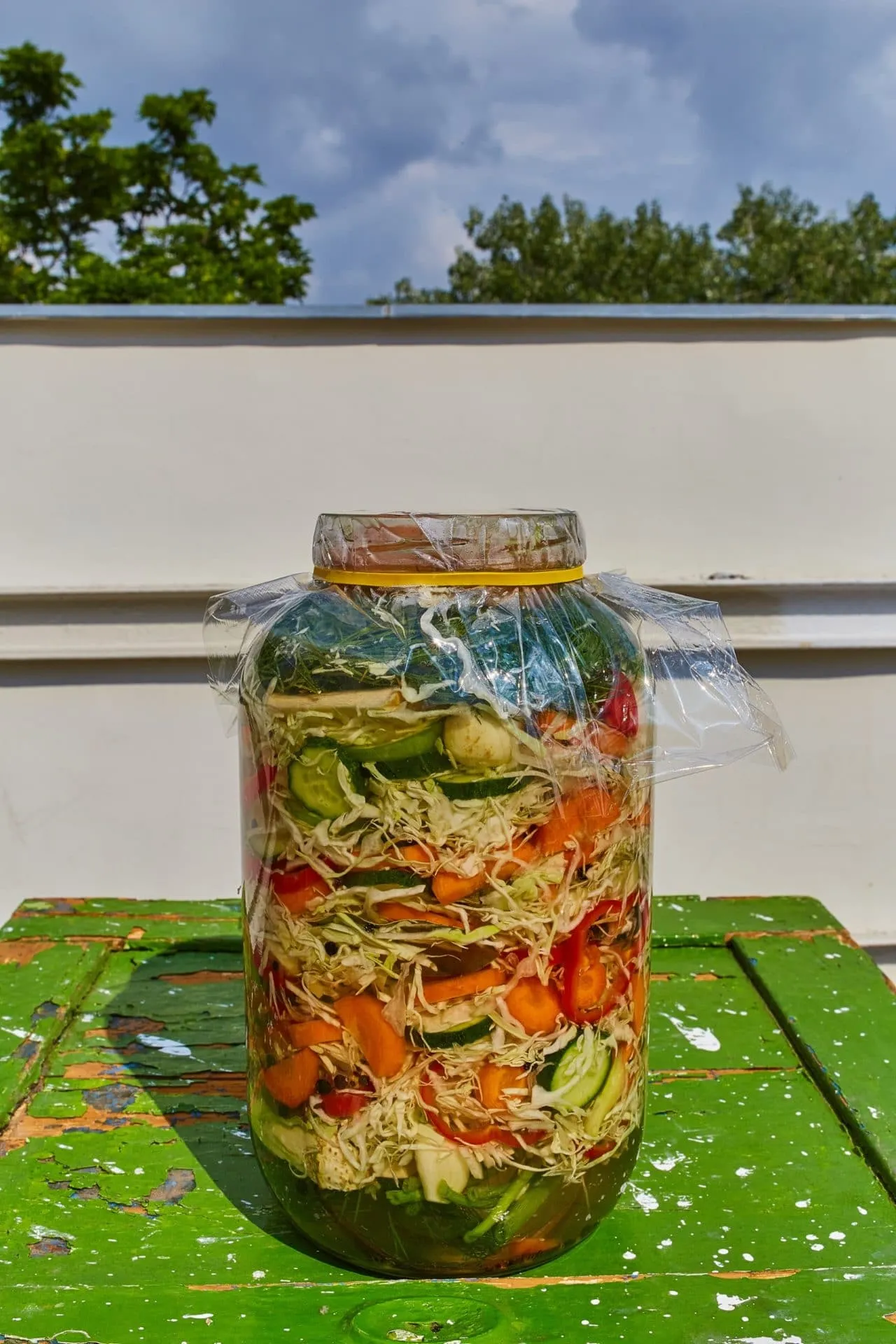 1 liter vízből és 1 púpozott evőkanál sóból oldatot készítünk, és felöntjük addig, hogy teljesen ellepje a csalamádét. Rátesszük a maradék kaprot és a kettévágott főtt burgonyát, majd egy fóliával letakarjuk, és napos, meleg helyen kb. egy hétig érleljük. Ezután a burgonyát és kaprot eltávolítjuk, majd az egészet hűtőben tároljuk.