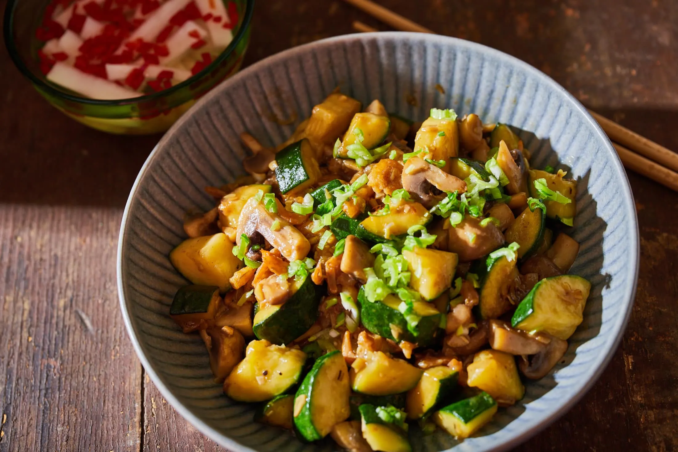 A fokhagymát, a gyömbért és az újhagyma fehér részét apróra vágjuk. Az újhagyma zöldjét félrerakjuk a tálaláshoz. A gombát negyedeljük, a cukkinit 2 cm-es kockákra vágjuk. A salátához a chiliket kimagozzuk, és 0,5 cm-es darabokra vágjuk, majd félretesszük. Egy serpenyőben olajat melegítünk, majd beleöntjük a fokhagyma, az újhagyma és a gyömbér keverékét. 1 percig pirítjuk közepes lángon, majd beletesszük a cukkinikockákat. További 1 percig pirítjuk, és hozzáadjuk a gombákat is.