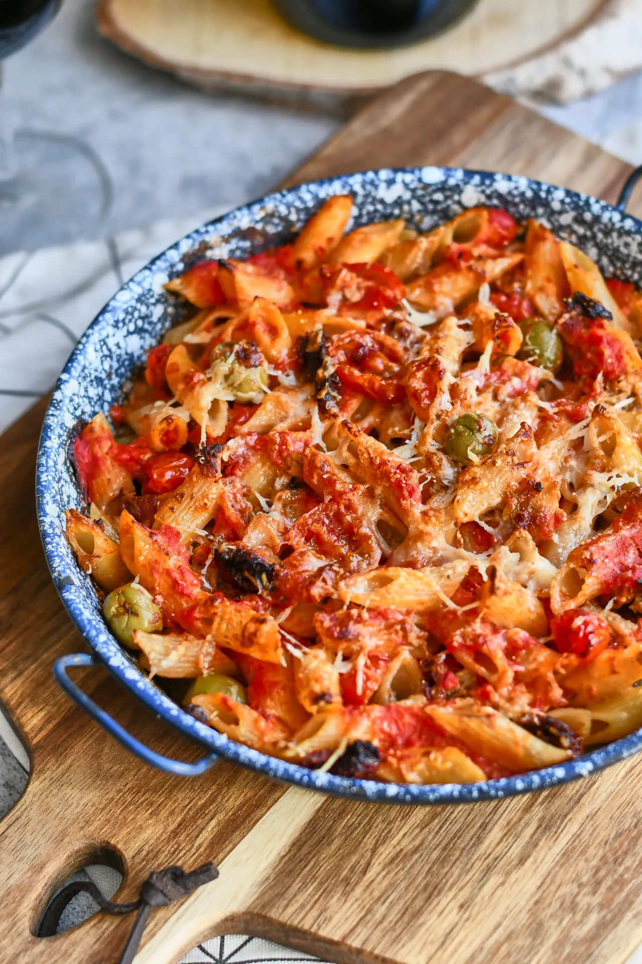 A pennét bő, sós, forró vízben elkezdjük főzni. Közben az olajon lepirítjuk az apróra vágott hagymát és fokhagymát, majd felöntjük a borral, és pár percig még forraljuk. Beledobjuk a konzerv paradicsomot, hozzáadjuk a fűszereket, és még pár percig főzzük. Belekeverjük a tonhalkonzervet, az olajbogyókat, a vékony csíkokra vágott aszalt paradicsomot, a reszelt parmezánt és az al dentére főtt tésztát. Egy Hőálló tálba rakjuk a pennét, esetleg reszelünk még rá kevés parmezánt, és 180 fokra előmelegített sütőbe tolva 25 percig sütjük.