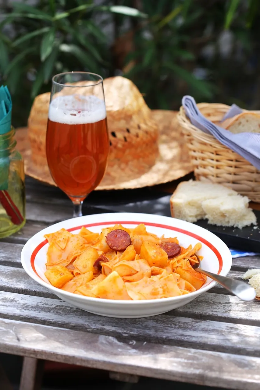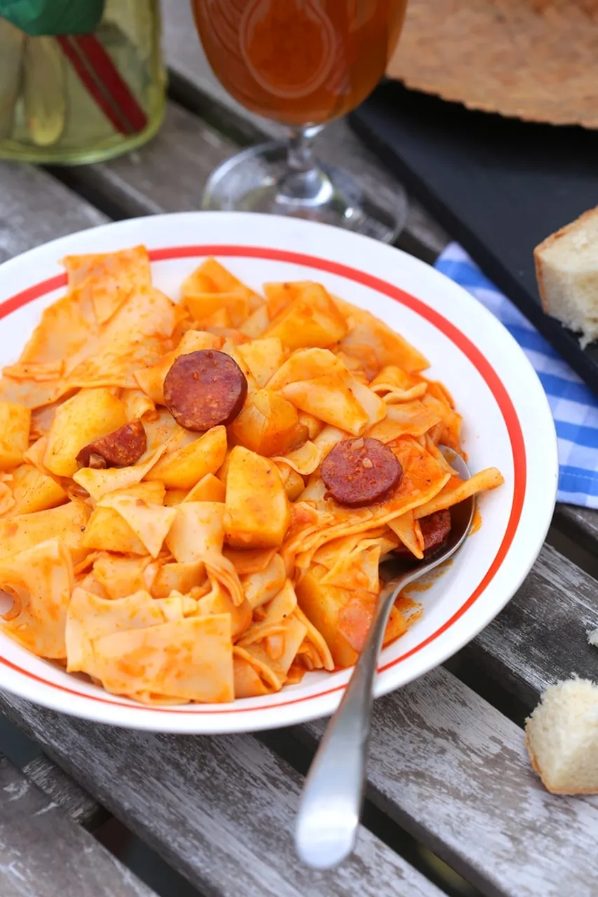 Ha a szalonna már kezd tepertősödni, hozzáadjuk az egyenletesre tört tésztát és lepirítjuk, majd mehet bele az aprított hagyma, fokhagyma és a kolbászkarikák. Kicsit együtt pirítgatjuk, majd hozzáadjuk a felvágott paprikát és a paradicsomot is. Rászórjuk a fűszereket, összeforgatjuk, beledobjuk a burgonyát, majd pár perc után felöntjük annyi vízzel, hogy éppen ellepje. Néha megkeverjük és ha megpuhult a burgonya, akkor kész is vagyunk. Tálalásig fedő alatt pihentetjük 10 percig.