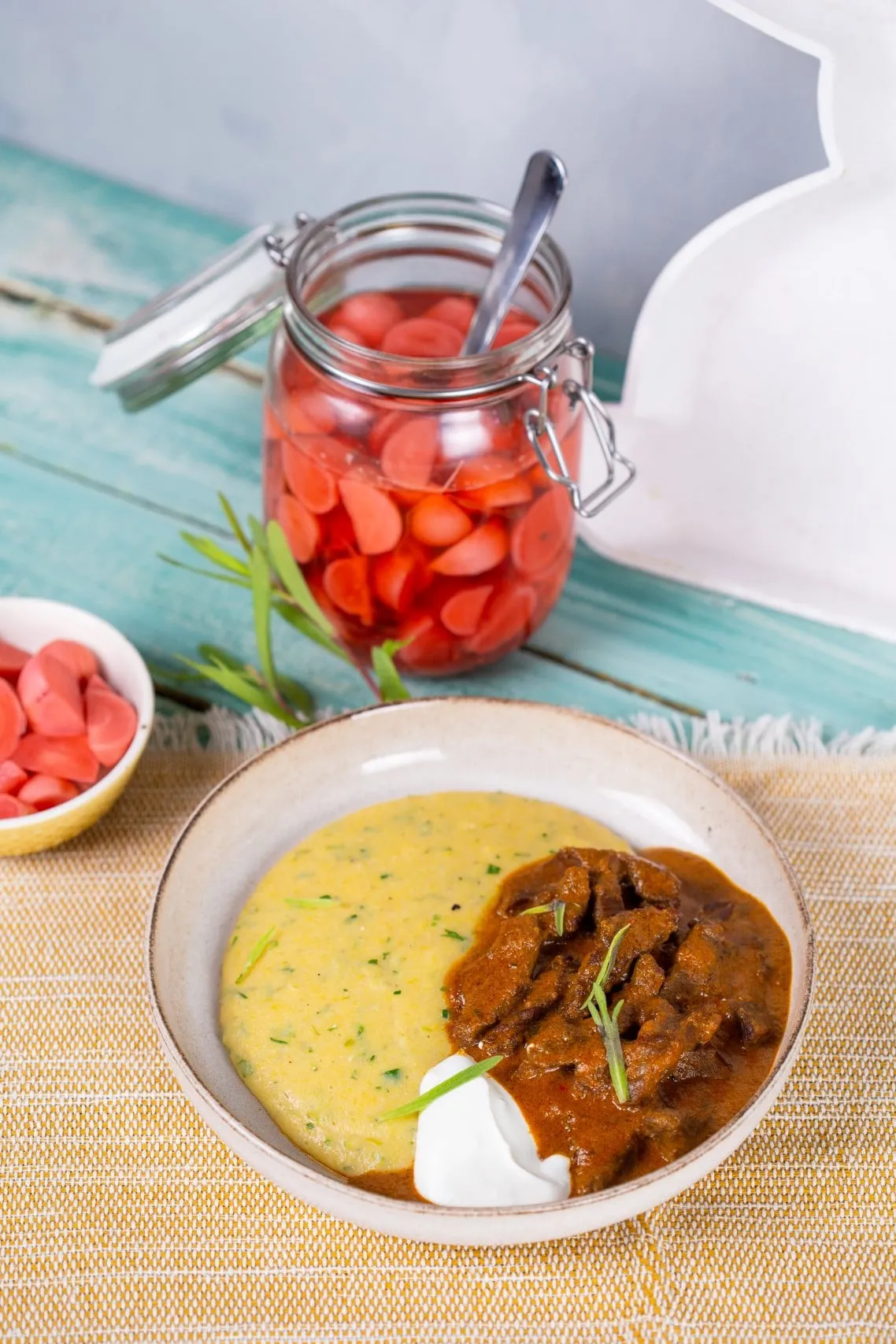 A puliszkához a felszeletelt újhagymát és fokhagymát megfonnyasztjuk az olívaolajon, sózzuk, borsozzuk, majd beleöntjük a kukoricadarát, és folyamatos keverés mellett hozzáadagoljuk az alaplevet. Lassú tűzön kb. 30 perc alatt készre főzzük, majd lehúzzuk a tűzről, belekeverjük az aprított petrezselymet, a tormát, a reszelt parmezánt és a vajat. Ha szükséges, még sózzuk, borsozzuk. Savanyított retekkel fogyasztjuk, aminek receptjét megtaláljátok a húsvéti magazinban a minireceptek résznél.