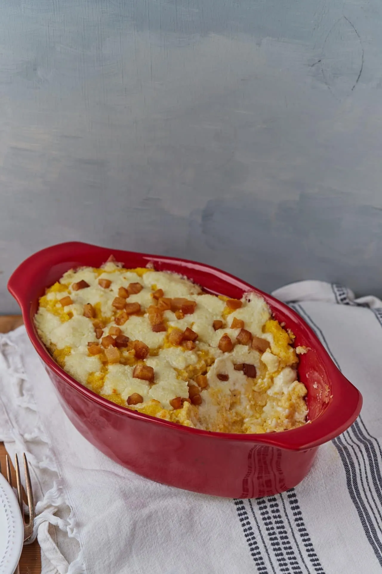 A szalonnát kisebb kockákra vágjuk és zsírjára sütjük. A pörcöt kiszedjük egy kis tálkába, de a zsírt is félrerakjuk. A kukoricadarát folyamatos keverés mellett tejbegríz állagúra főzzük a tej és víz keverékével, sóval és borssal. Egy sütőtál aljára egy kevés szalonnazsírt öntünk, amin elsimítjuk a megfőtt dara ⅓-át. Erre rámorzsoljuk a juhtúró szintén ⅓-át, és meglocsoljuk egy kevés zsírral, valamint megszórjuk a reszelt sajt felével. Erre jön egy újabb ilyen réteg, majd az utolsó réteg főtt dara, amire rámorzsoljuk a maradék juhtúrót, megszórjuk a szalonnával, és ha marad szalonnazsír, azt is ráöntjük. 190 fokra előmelegített sütőbe toljuk kb. 10-15 percre, hogy összeolvadjon a sajt, a juhtúró és a kukoricadara.