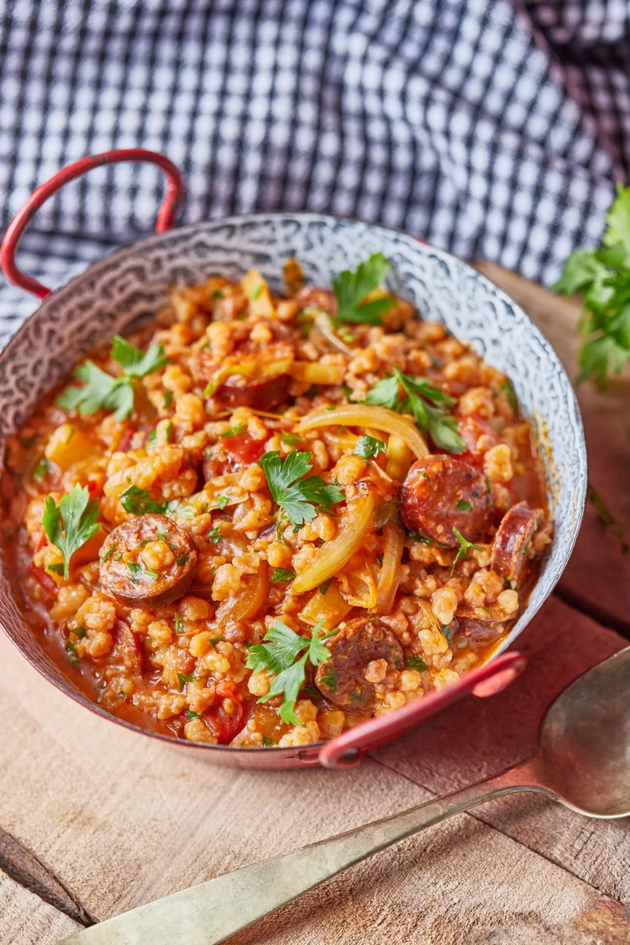 A kolbászt felkarikázzuk, majd lepirítjuk a zsíron, hogy kiengedje a saját zsírját is, aztán egy szűrőkanállal eltávolítjuk, és félretesszük. A kiolvadt kolbászzsíron sötétebb aranybarnára pirítjuk a tarhonyát, majd felöntjük az alaplével vagy vízzel. Visszatesszük a kolbászt a tarhonyára, ízlés szerint sózzuk, borsozzuk, és közepes rotyogtatás mellett néha megkavarva készre főzzük (ha nem főtt meg, teszünk még hozzá egy kevés vizet vagy alaplevet). Hozzáöntjük az elkészült lecsót, rátesszük az aprított petrezselymet, elkeverjük, és kóstolás után ízlés szerint sózzuk, borsozzuk. Kenyérrel és savanyúsággal is fogyaszthatjátok, úgy az igazi.
