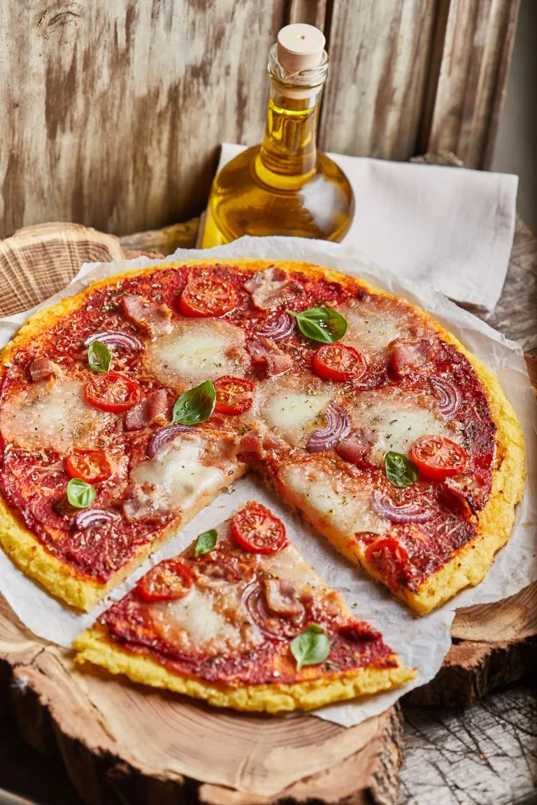Miután kihűlt, a pizzaszósz hozzávalóit összekeverjük és rákenjük a pizzára. Ráreszeljük a parmezánt, rátépkedjük a mozzarellát, rápakoljuk az elfelezett paradicsomokat, a felszeletelt lilahagymát és a nagy kockákra vágott bacont. 230 fokra előmelegített sütőben addig sütjük, amíg egy kicsit meg nem pirul az egész. Ez kb. 20-25 perc. Miután kész, kivesszük, hagyjuk 10 percet állni. Megszórjuk oregánóval, pár levél friss bazsalikommal díszítjük és kész is. Felszeletelve tálaljuk.