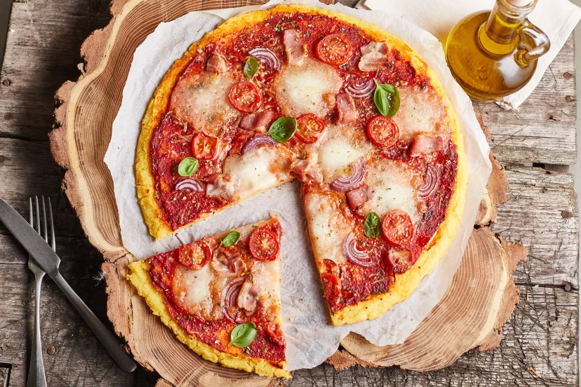 A polentához a kukoricadarát elkeverjük a vízzel, megsózzuk és egy lábasban kb. 15 perc alatt megfőzzük. Belereszeljük a parmezánt, fokhagymát, majd elzárjuk. Egy sütőpapírral kibélelt tepsire borítjuk és szépen egy spatulával kör alakúra elegyengetjük, kb. 30-32 cm nagyságúra. Ezután hagyjuk teljesen kihűlni. Ez azért kell, hogy megszilárduljon teljesen. Ha elősütnénk, a végére nagyon kiszáradna és nem lehetne szeletelni, mert széttörne.