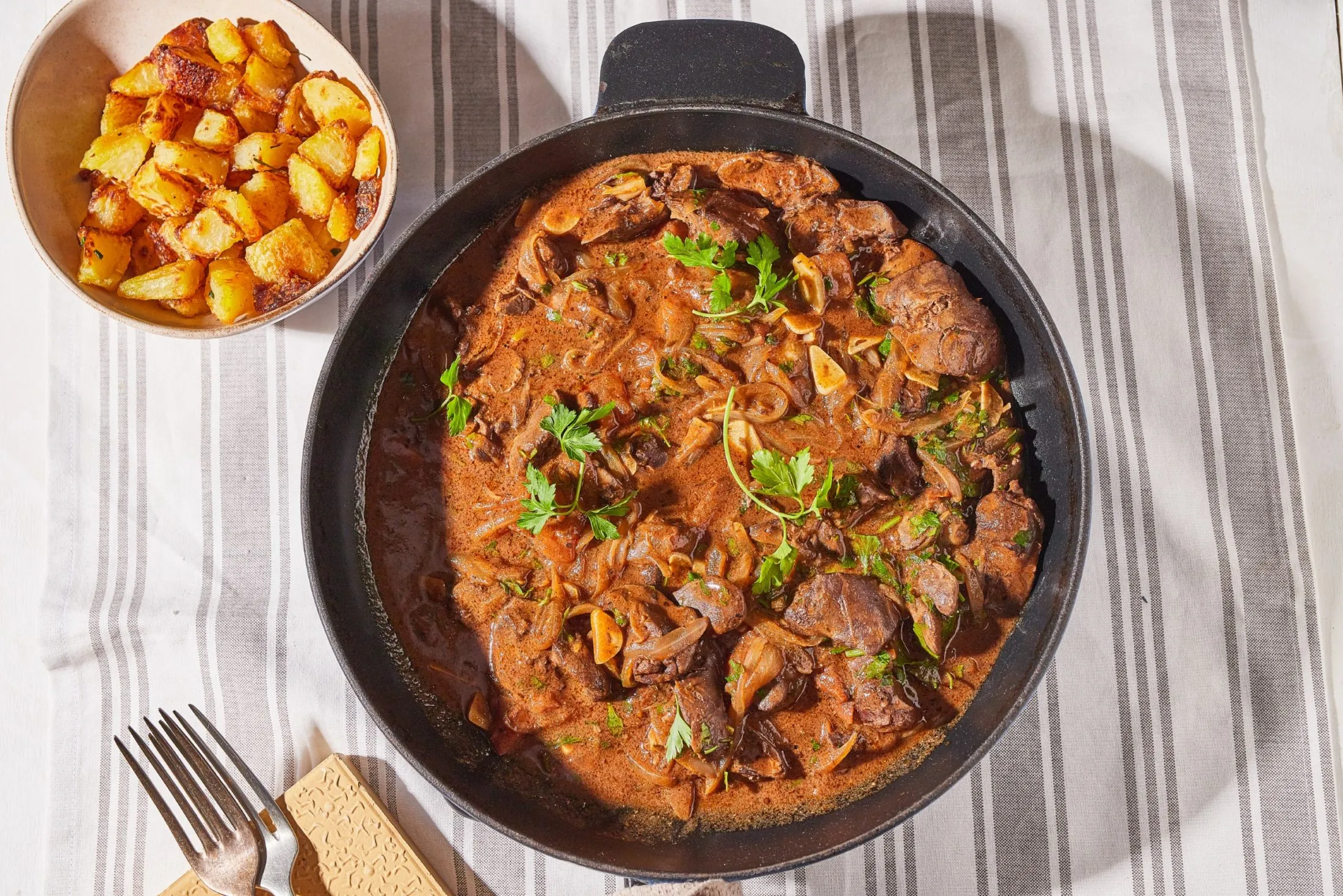 Vigyázzunk, ne főzzük túl a májat, és ne szárítsuk ki! Egy darabot kettévágva ellenőrizzük a készültségi fokát, akkor kapjuk a legszaftosabb végeredményt, ha még van egy kis rózsaszínes árnyalata a közepének. Végül megszórjuk aprított petrezselyemmel, és pirított burgonyával tálaljuk.