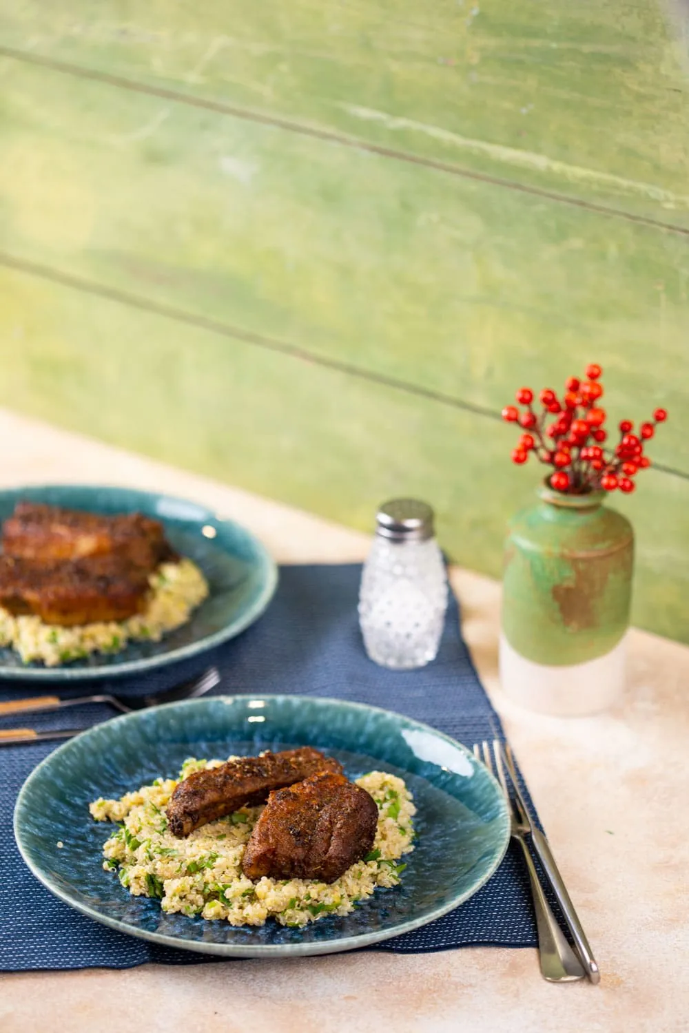 Közben a salihoz egy edényben bő, sós vízben megfőzzük egyszerre a quinoát és a vöröslencsét. Mindkettőnek ugyanannyi idő kell, kb. 15-20 perc, úgyhogy ha megpuhultak, leszűrjük, és még melegen egy tálban hozzákeverjük a vajat, és sózzuk, borsozzuk. Ha kihűlt, megszórjuk a felaprított zöld fűszerekkel, belefacsarjuk a citromlevet, és az oldalas mellé tálaljuk.