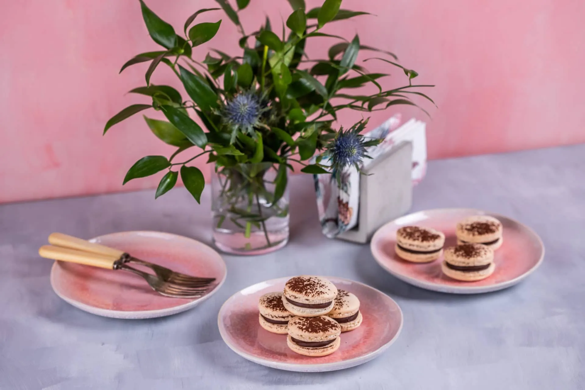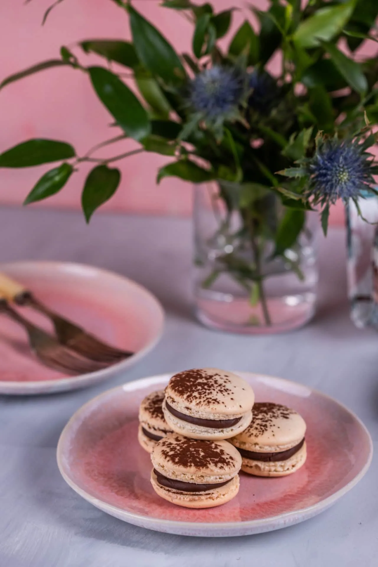 Mikor mindkét krém kihűlt (a csokis selymes, kenhető, a málnás kellőképpen stabil), akkor óvatosan levesszük a macaronokat a sütőpapírról. A csokis krémet habzsákba rakjuk, kivágjuk a végét és a macaronok szélére, karima alakban rányomjuk a krémet. A közepükön kialakult kis mélyedésbe töltünk 1-1 mokkáskanálnyi málnakrémet (a maradékot hűtőben tárolhatjuk), majd 1-1 másik macaront nyomunk a krémek tetejére. Díszítésként kevés kakaóporral megszórhatjuk a tetejüket.