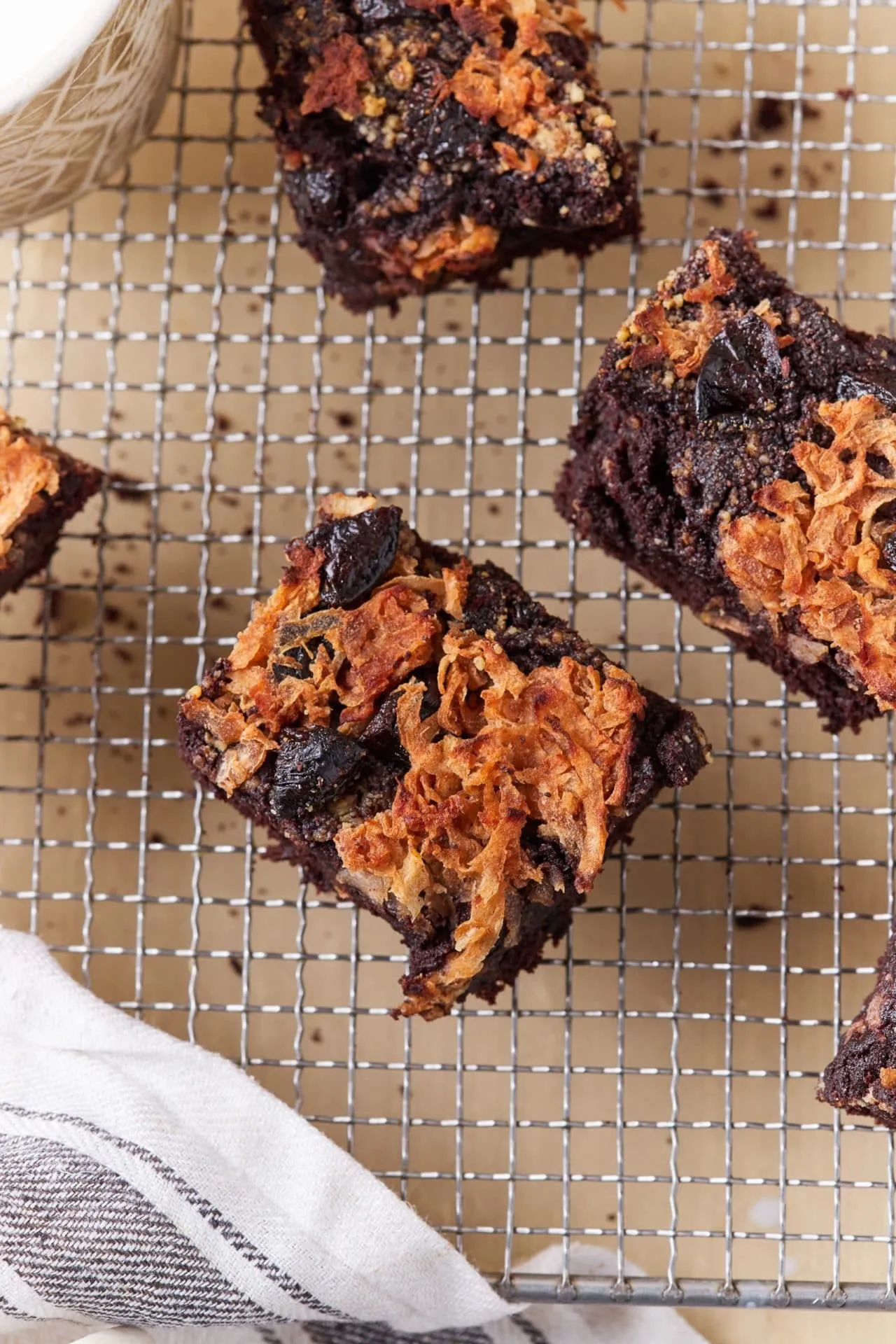 A vajat a csokival felolvasztjuk, és belekeverjük az édesítőt, valamint a vaníliát. A tojásokat kicsit felhabosítjuk. A liszteket, sót, sütőport, kakaót összekeverjük. A csokis keverékhez adjuk a tojást, majd a lisztes keveréket. Beleöntjük egy sütőpapírral bélelt tepsibe, megszórjuk a tetejét a mákkal, dióval, almával, aszalt szilvával, és 180 fokra előmelegített sütőben 28-35 percig sütjük. Az édesítőtől kicsit morzsalékosabb lesz, mintha cukorral csinálnánk, de nem kell megijedni.