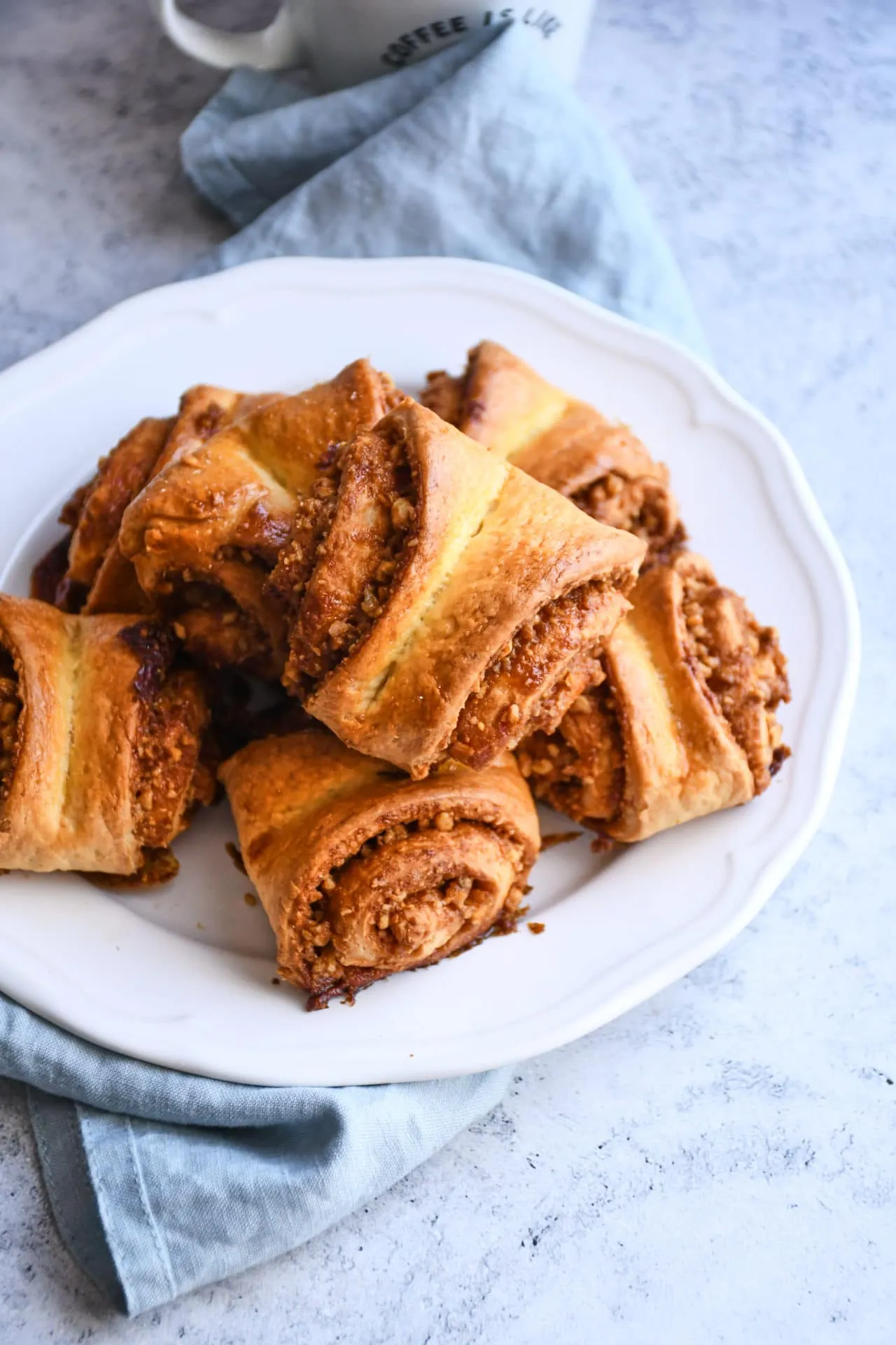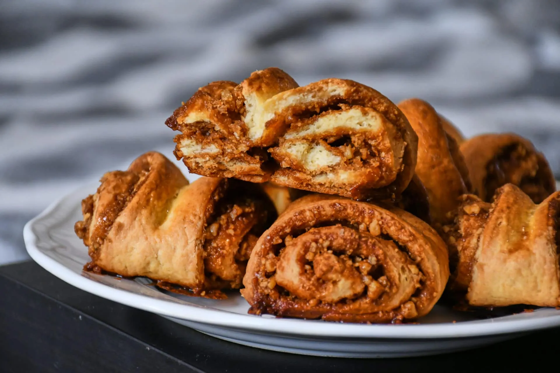 A tésztához a tejet meglangyosítjuk, beleszórjuk az élesztőt és egy kanál cukrot, elkeverjük, és hagyjuk pár percet pihenni. A maradék cukrot összekeverjük a sóval, a liszttel és a tojássárgákkal, majd mehet bele a felfuttatott élesztős tej. Elkezdjük összedolgozni a tésztát, majd hozzáadjuk a puha vajat, és jól bedagasztjuk. Letakarva 40-50 percig kelesztjük.