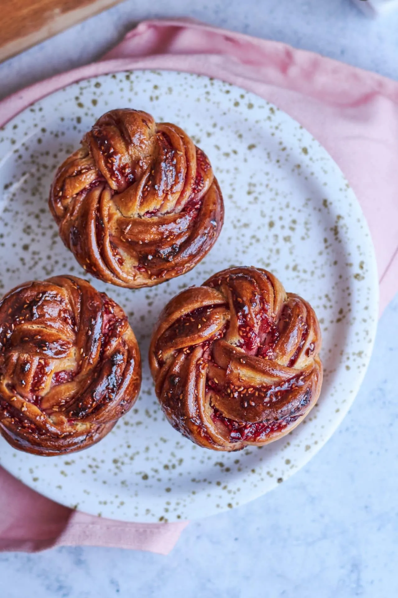 Mikor megkelt a tészta, újra átgyúrjuk, és 8 egyenlő részre osztjuk. Mindegyik gombócot kb. 18 x 12 cm-esre nyújtjuk, megkenjük a málnás töltelékkel, a hosszabbik oldala felől feltekerjük, keresztben kettévágjuk és a vágási felükkel felfelé összetekerjük, majd a végüket a tekercs alá hajtjuk, és belerakjuk a muffinformákba. 20 percig kelesztjük őket, lekenjük a tetejüket tojással, majd 175 fokra előmelegített sütőben kb. 35-40 perc alatt aranybarnára sütjük. Még forrón meglocsoljuk a sziruppal.