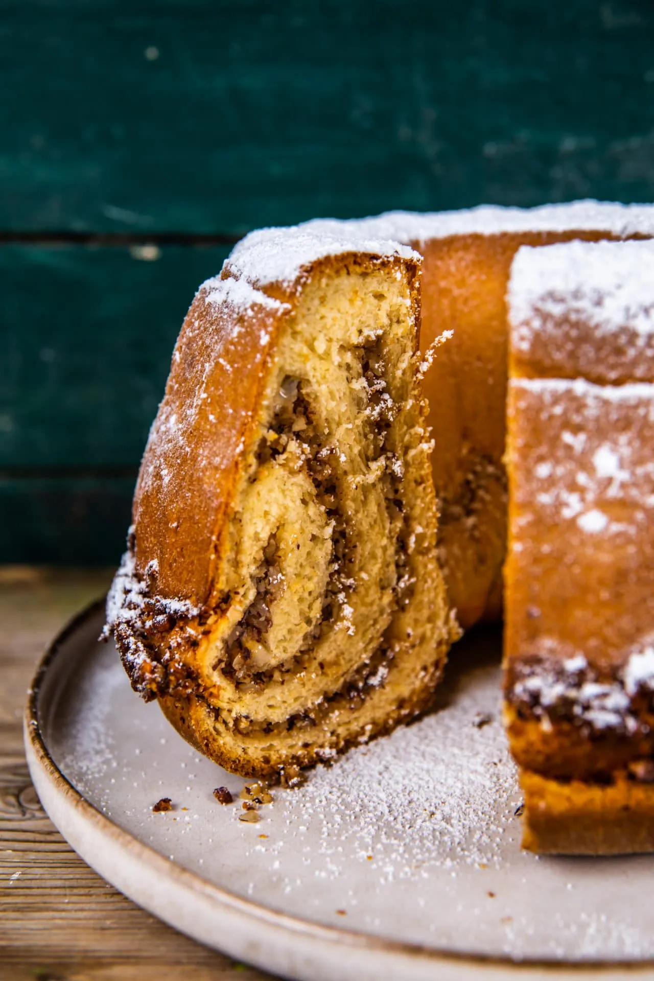 A töltelékhez felverjük a fehérjéket, majd belekeverjük a többi hozzávalót. Megkenjük vele a kinyújtott tésztát, a hosszabbik oldala mentén feltekerjük, és belerakjuk a kuglófformába. 40-50 percig kelesztjük, amíg szépen megkel, majd berakjuk a 175 fokra előmelegített sütőbe kb. 35-40 percre. Mikor langyosra hűlt, kiborítjuk a kuglófformából, megszórjuk porcukorral, és szeletekre vágva tálaljuk.