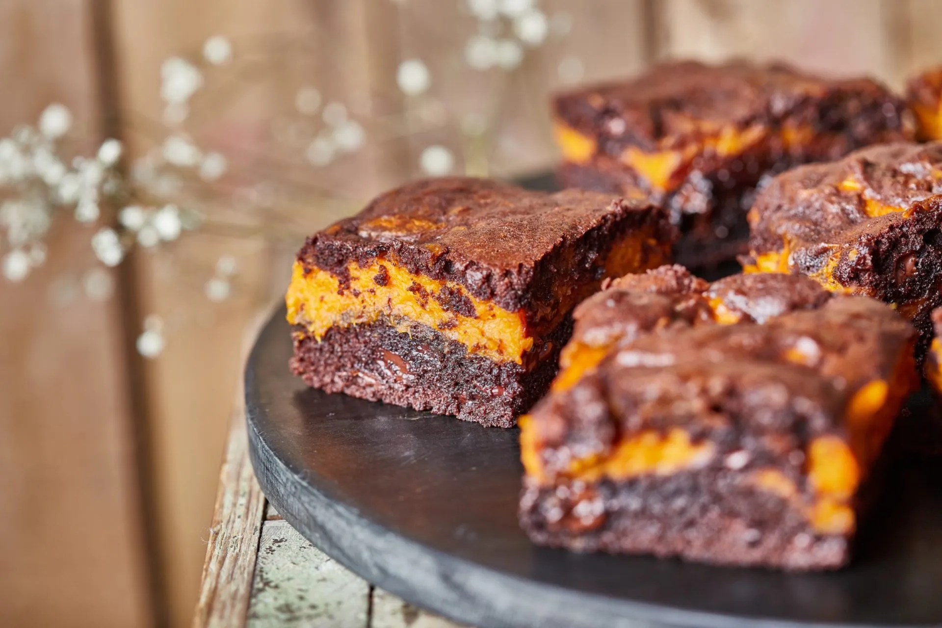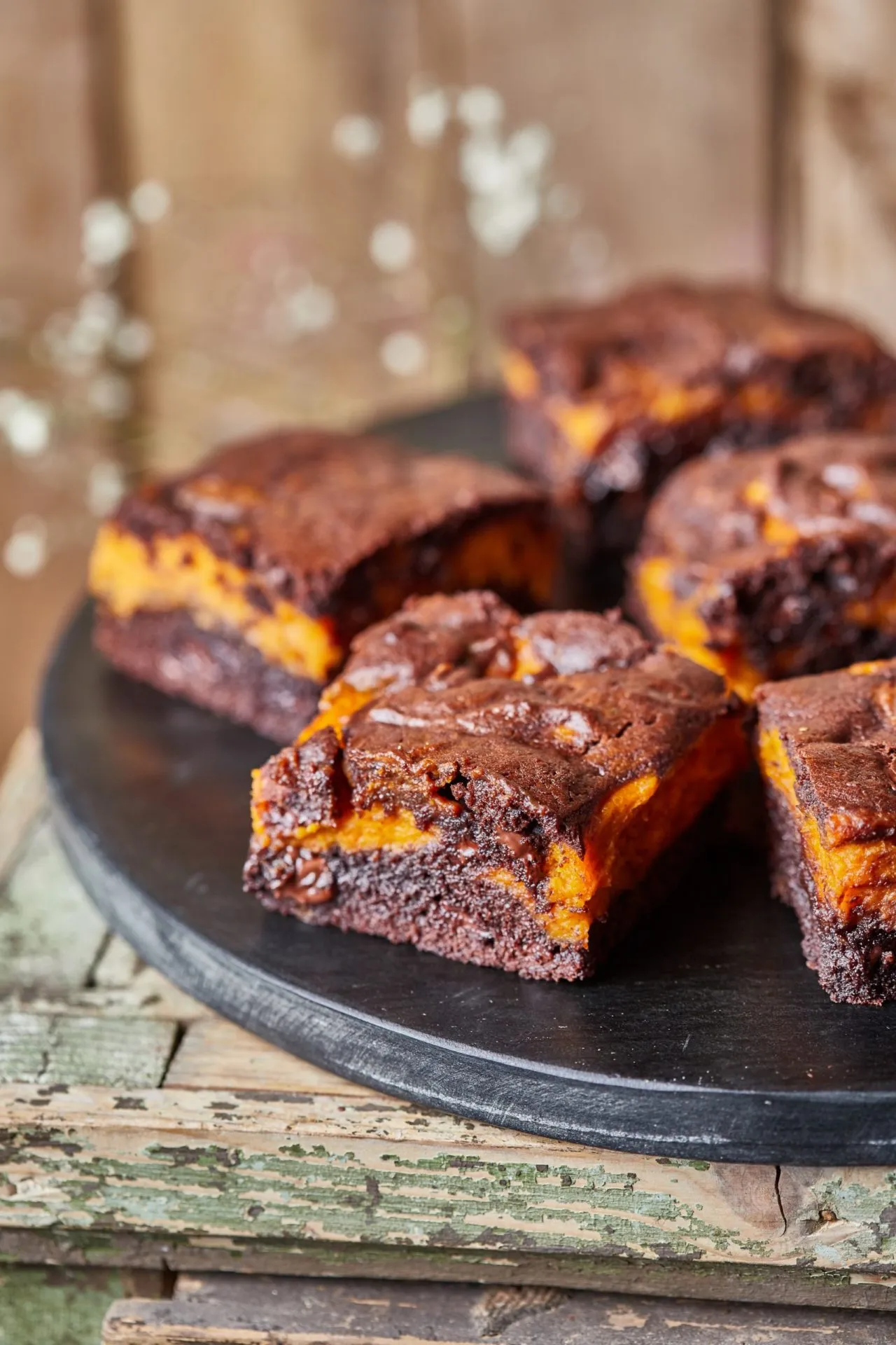 Az alaptésztához a vajat összekeverjük a cukorral, majd kihabosítjuk a tojásokkal. Ezután csomómentesre keverjük a liszttel és a sütőporral. A tészta egyik felét beleöntjük az aprítógépbe, amiben a sütőtök van, majd jól lezúzzuk. A maradék tésztába belekeverjük a kakaóport és a csokit. A sütőpapírral bélelt tepsi aljára rakjuk a csokis keverék ¾-ét, elsimítjuk, majd erre jöhet a sütőtökös rész. A maradék csokis tésztát nagyobb pöttyökben rárakjuk és egy kis késsel belehúzgálunk, hogy mintás legyen a teteje. 180 fokra előmelegített sütőben 30 perc alatt megsütjük. Ha kicsit hűlt, kockákra vágva tálaljuk.