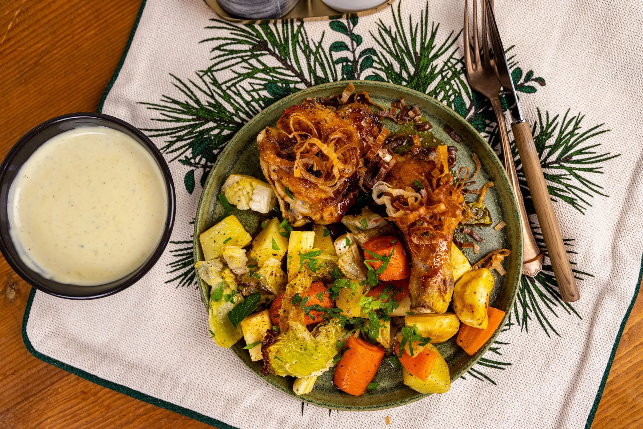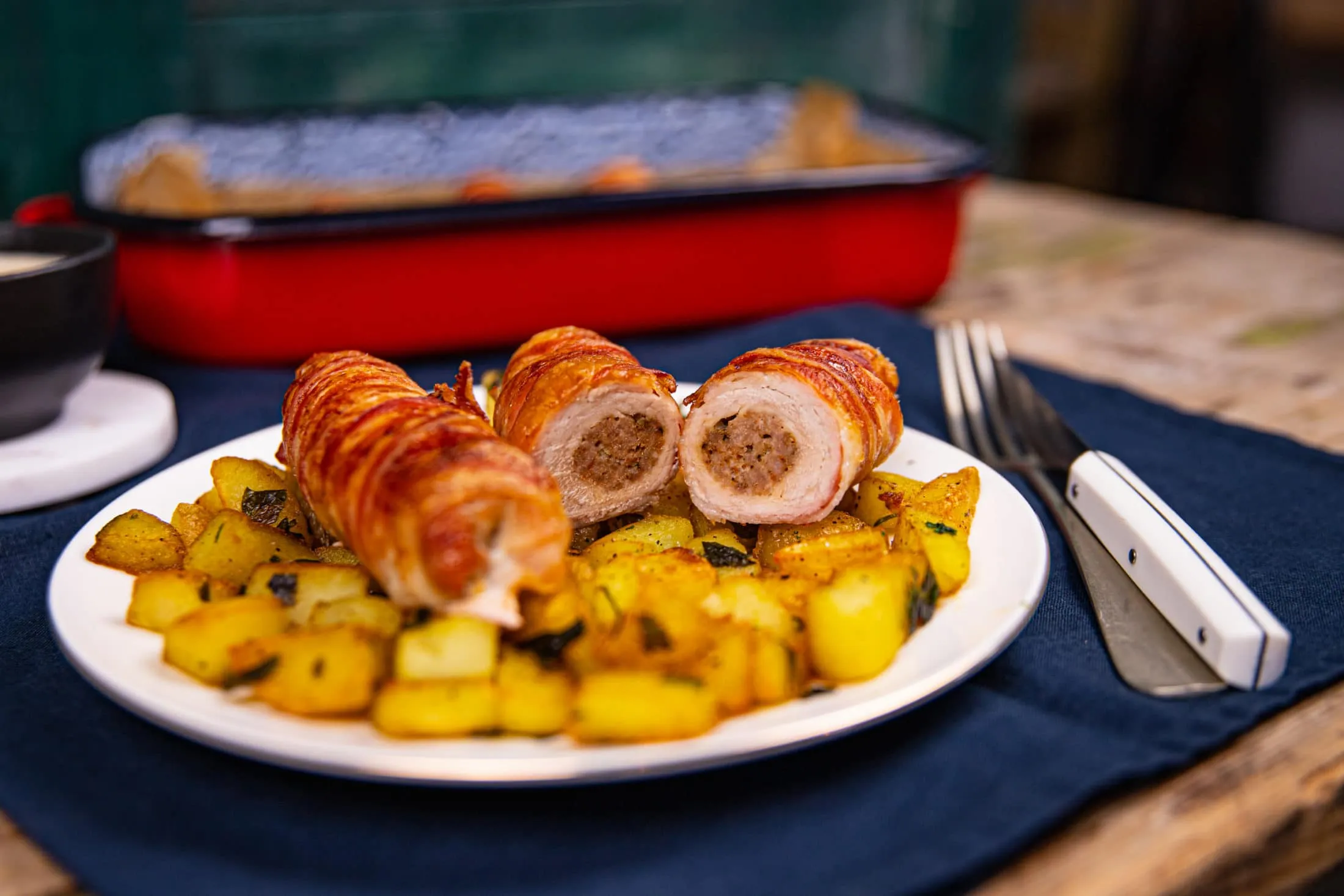 Gombával töltött pulykamellrolád karamellizált lilahagyma-gerezdekkel