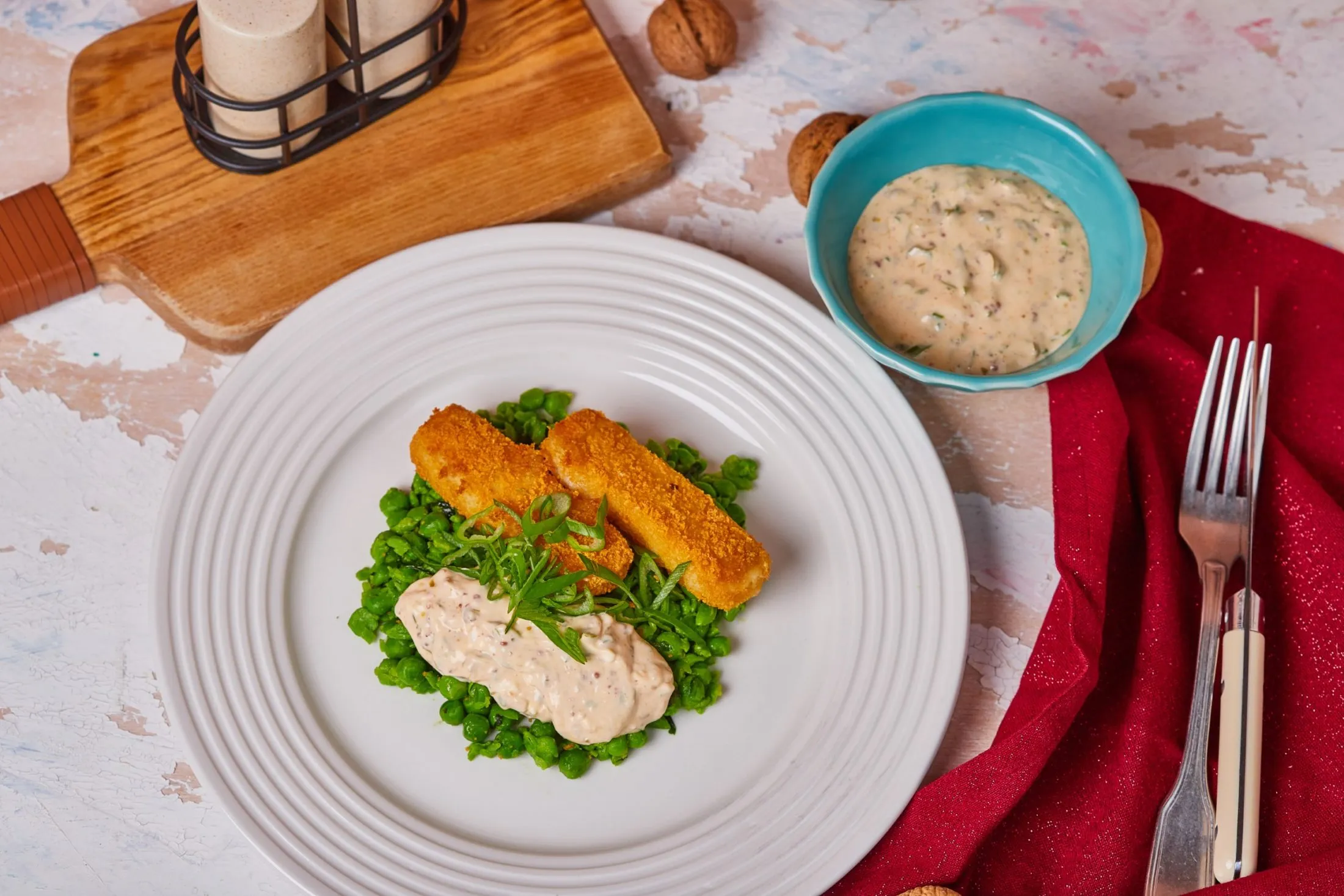 Gluténmentes halrudak fűszeres tört zöldborsóval és remulád mártással