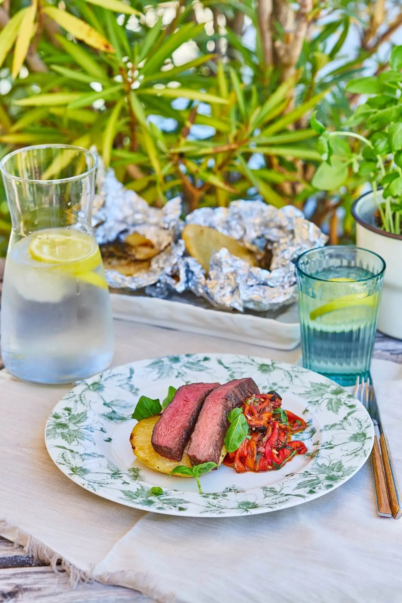 Közben a zellergumót kb. 1 cm vastag szeletekre vágjuk, sózzuk, borsozzuk, az olívaolajjal meglocsoljuk, majd fokhagymával és kakukkfűvel fóliába csomagolva a grillre tesszük, és időnként megforgatva 15-20 perc alatt készre sütjük.