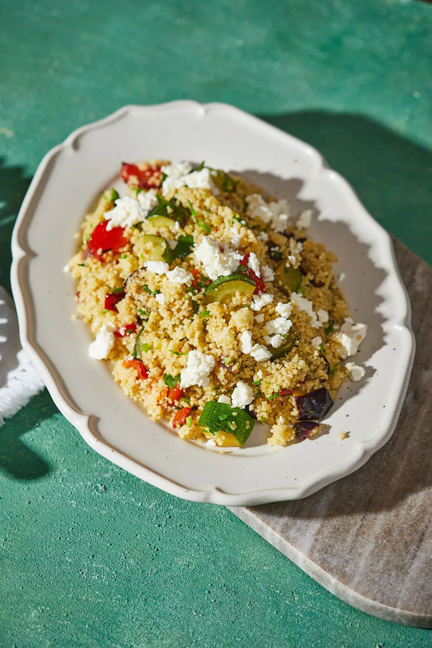 Kiszedjük, majd ugyanabba a serpenyőbe 3 evőkanál olajat öntünk, és elkezdjük lepirítani a paprikát. Megszórjuk egy csipet sóval, majd 3-4 perc pirítás után mehet bele a cukkini is, sózzuk, borsozzuk és további 3 percig pirítjuk. Rárakjuk a padlizsánt, és 2-3 perc alatt összepirítjuk. Belerakjuk a kuszkuszt, a petrezselymet, a citromlevet, és fetával megszórva tálaljuk.