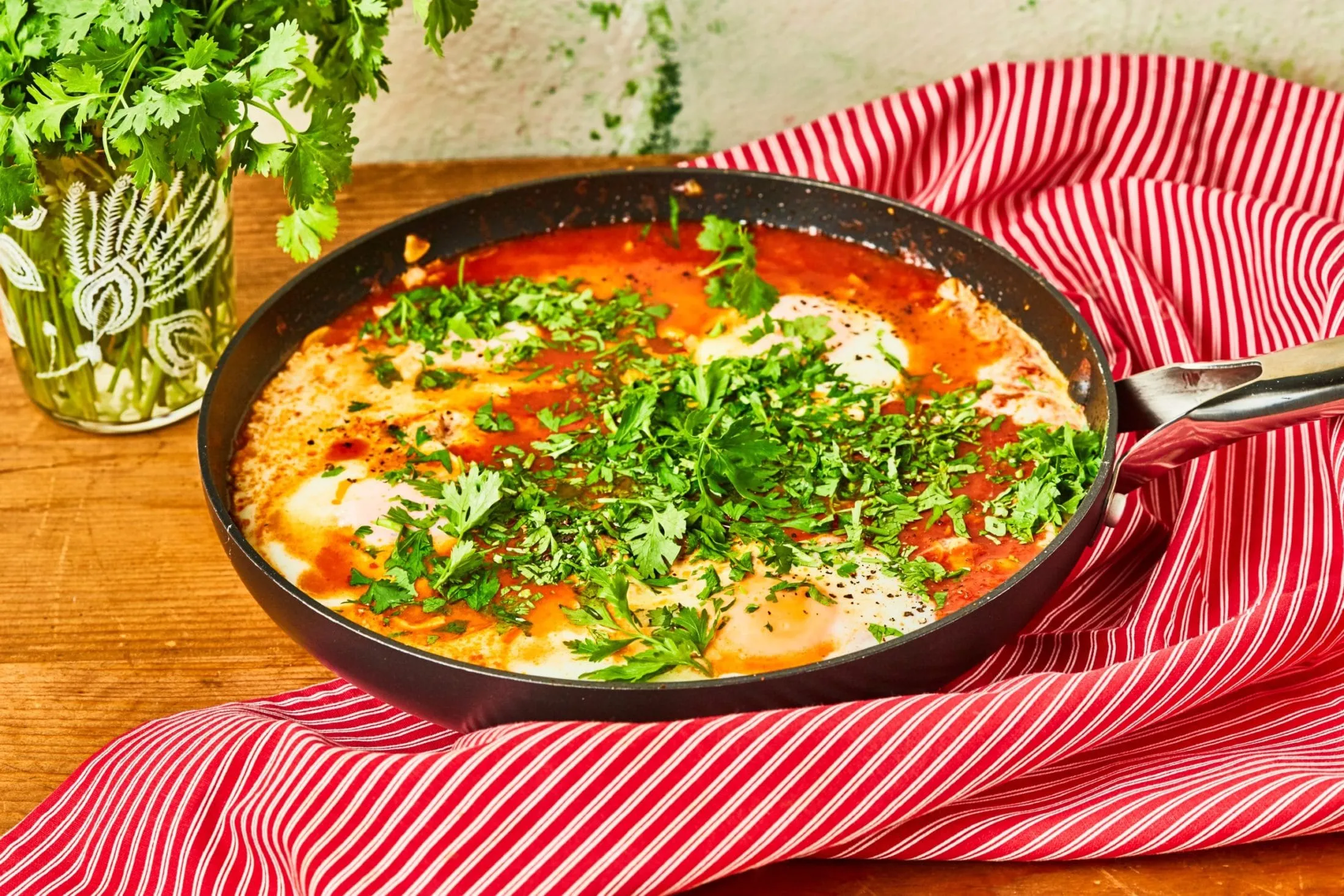 Sózzuk, borsozzuk, mehet hozzá a chipotle és a füstölt pirospaprika, majd ha ezzel is átforgattuk, akkor felöntjük a paradicsommal. Ha sűrűnek találjuk, kevés vízzel hígíthatjuk, és alacsony lángon rotyogtatjuk kb. 10 percig, majd óvatosan ráütjük a tojásokat, és fedő alatt alacsony lángon addig pötyögtetjük, amíg a tojásfehérje már megfőtt, de a sárgája még folyós.