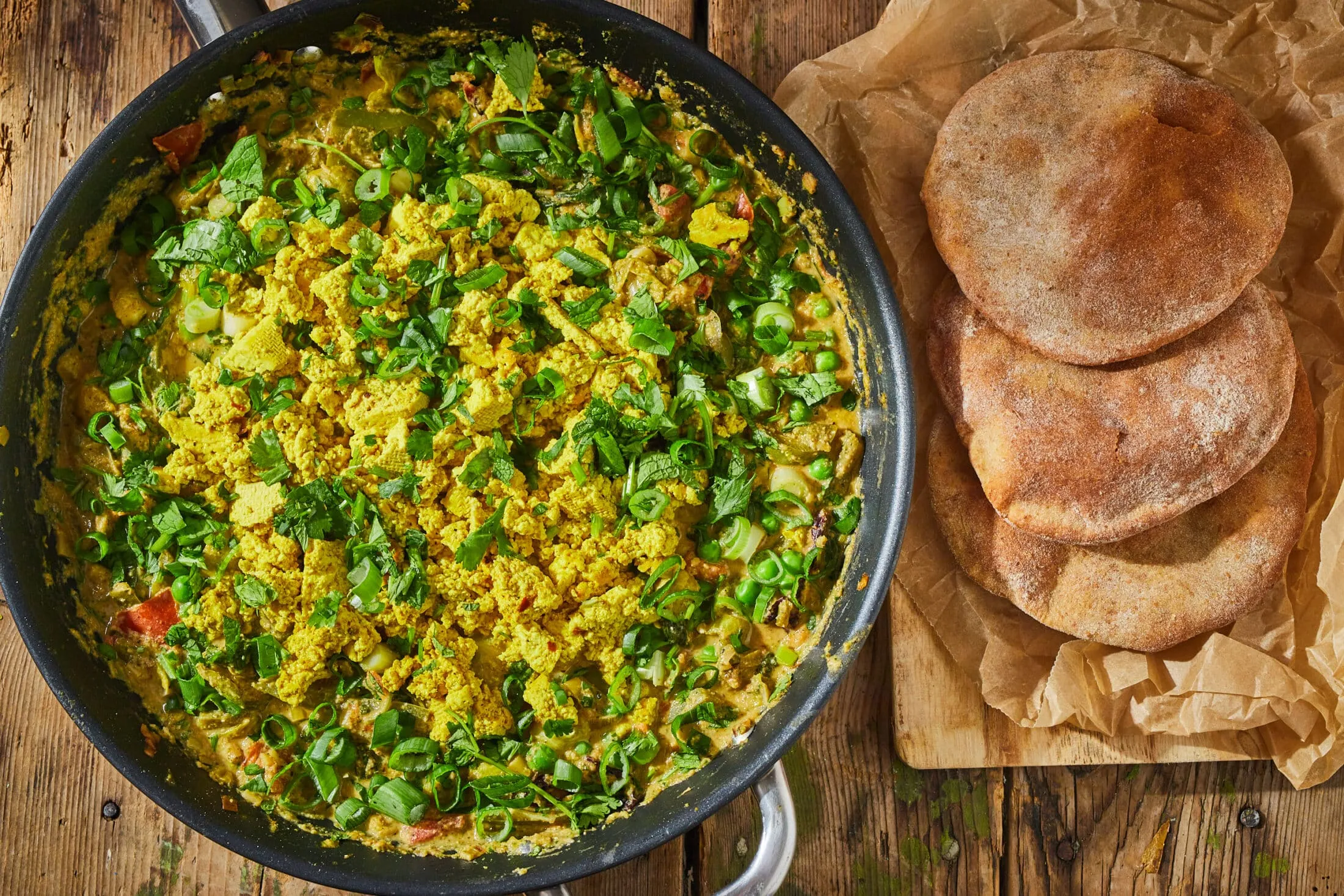 A zöld shakshukát citromlével ízesítjük, hozzáadjuk a zöldborsót, megszórjuk az aprított zöldfűszerekkel és a karikára vágott újhagymával. A tetejére halmozzuk a tofu „tojást”, és készen is vagyunk. Jöhet a tunkolás a pitával!