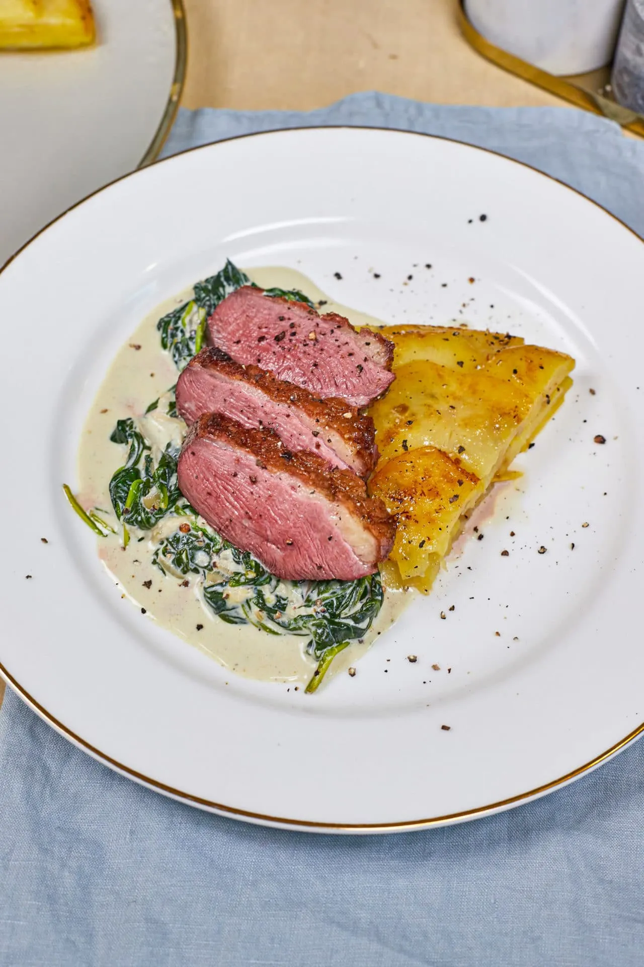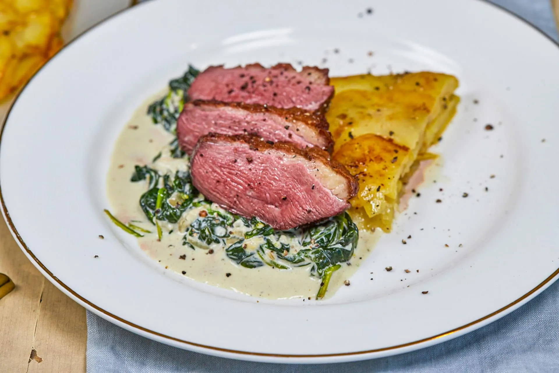 Tálaláskor a húst száliránnyal ellentétesen felszeleteljük, a krumpliból háromszög alakú szeletet vágunk és a tejszínes spenóttal kínáljuk.