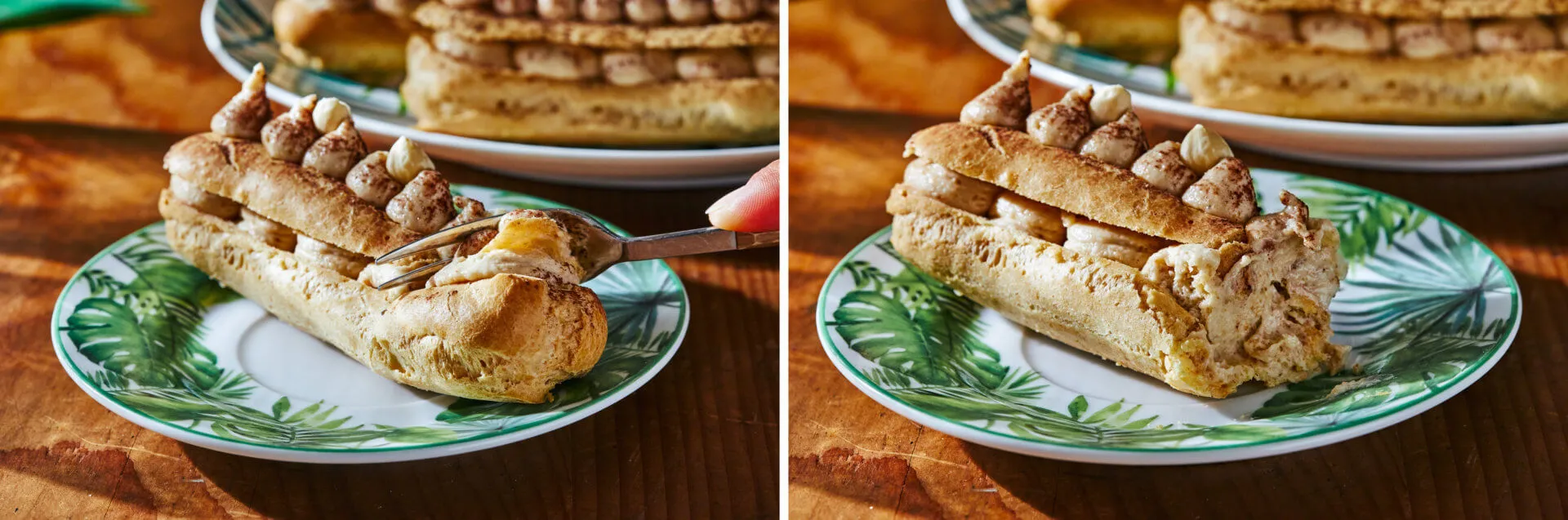 A homogénre kevert masszát nyomózsákba töltjük, és egymástól 3 ujjnyi távolságra kb. 9-10 cm-es csíkokat nyomunk belőle egy sütőpapírral bélelt tepsire. A 200 fokra előmelegített sütő aljába egy vízzel teli edényt rakunk, hogy gőzös teret kapjunk, majd kb. 20 perc alatt megsütjük az eklereket. Ezután kikapcsoljuk a sütőt, és egy fakanál nyelével kitámasztva hagyjuk, hogy így hűljenek ki.