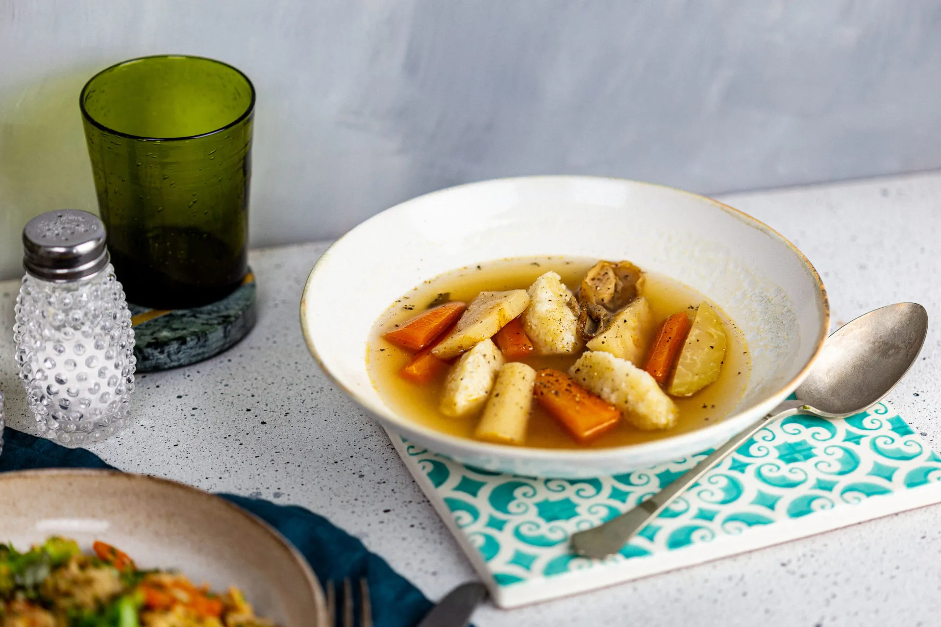 A leves hozzávalóit egy nagy lábasba pakoljuk, és felengedjük annyi vízzel, hogy színültig legyen az edény. Felforraljuk, majd alacsony lángon 1 órát rotyogtatjuk. Közben 2 kisebb tojásfehérjét egy nagy csipet sóval kemény habbá verünk. Belekeverjük a többi hozzávalót és egy spatulával összeforgatjuk. Lefedjük egy tányérral, és 10 percet hagyjuk állni. Teáskanállal kis galuskákat szaggatunk belőle, és bő sós vízben addig főzzük, amíg fel nem jön a tetejére, ezután még 4-5 percig főzzük, végül leszűrjük.