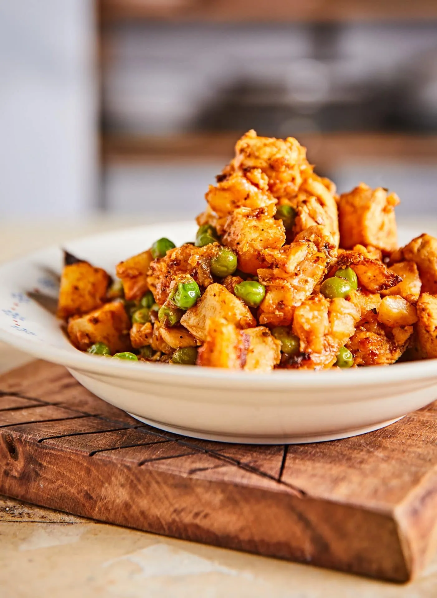 A raguhoz a csirkemellet kisebb kockákra vágjuk, sózzuk, borsozzuk, és 1 evőkanál olajon magas hőmérsékleten körbepirítjuk, majd kiszedjük. A visszamaradt szaftra öntünk még egy kanál olajat, és üvegesre pároljuk rajta az apróra vágott hagymát és fokhagymát, sózzuk, borsozzuk. Elkeverjük benne a fűszereket, majd felöntjük kb. 150 ml vízzel. Az a lényeg, hogy egy jó kis hagymás alapot kapjunk, tehát ha nagyjából elfőtte a vizet, akkor ezt még kétszer megismételjük. Visszarakjuk a húst, belerakjuk a borsót, felöntjük 2-300 ml vízzel, és addig rotyogtatjuk, amíg kicsit be nem sűrűsödik a szaft és össze nem áll a ragu. Ezután belekeverjük a sült zellert, és kész.