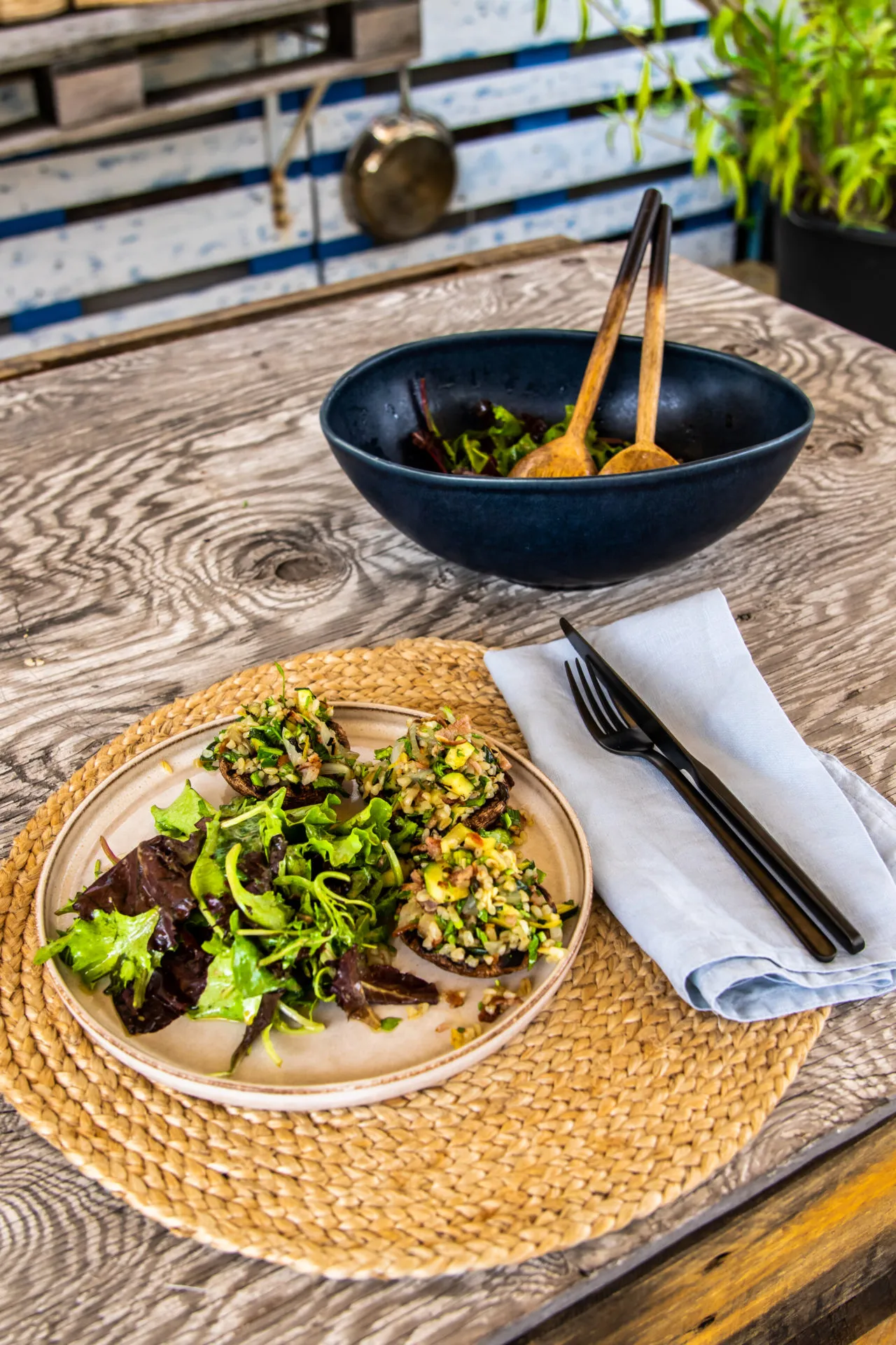 Az 1 cm-es szeletekre vágott cukkinit és az elfelezett vöröshagymát (héjastul) meggrillezzük. A bacont is feldobjuk a grillre, majd a megmosott gombát is pár perc alatt meggrillezzük. Ezután apróra vágjuk a cukkinit, a hagymát és a bacont, majd összeforgatjuk a felaprított petrezselyemmel, a citromhéjjal, a citromlével és a bulgurral, sózzuk, borsozzuk, meglocsoljuk pár csepp olívaolajjal, és visszatöltjük a gombába.