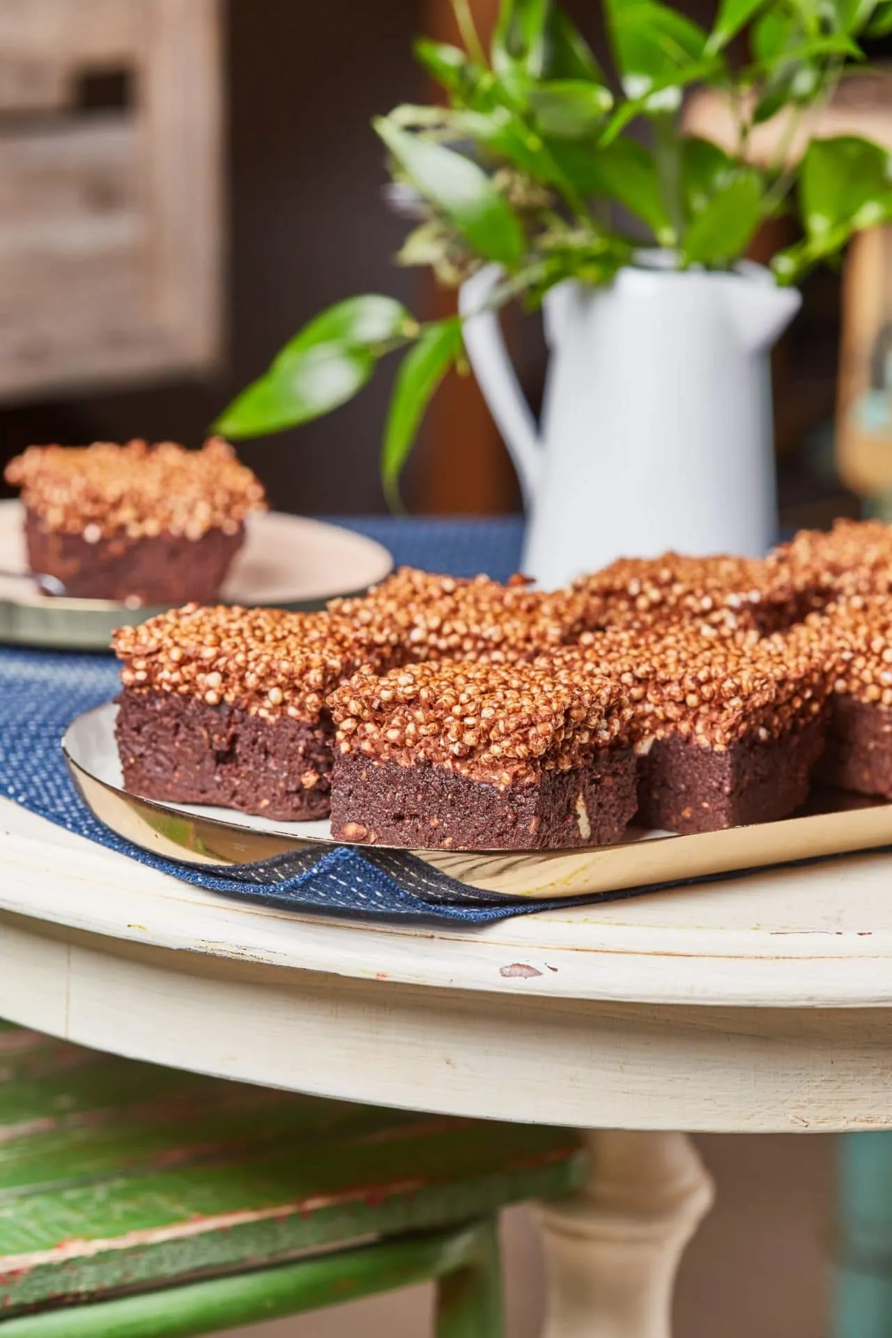 A tetejére vízgőz fölött összeolvasztjuk az étcsokit és a kókuszolajat, majd belekeverjük a mogyoróvajat és a puffasztott quinoát. Ezt a masszát a „brownie-ra” simítjuk, és dermedésig hűtőbe rakjuk. Forró, éles késsel szeleteljük.
