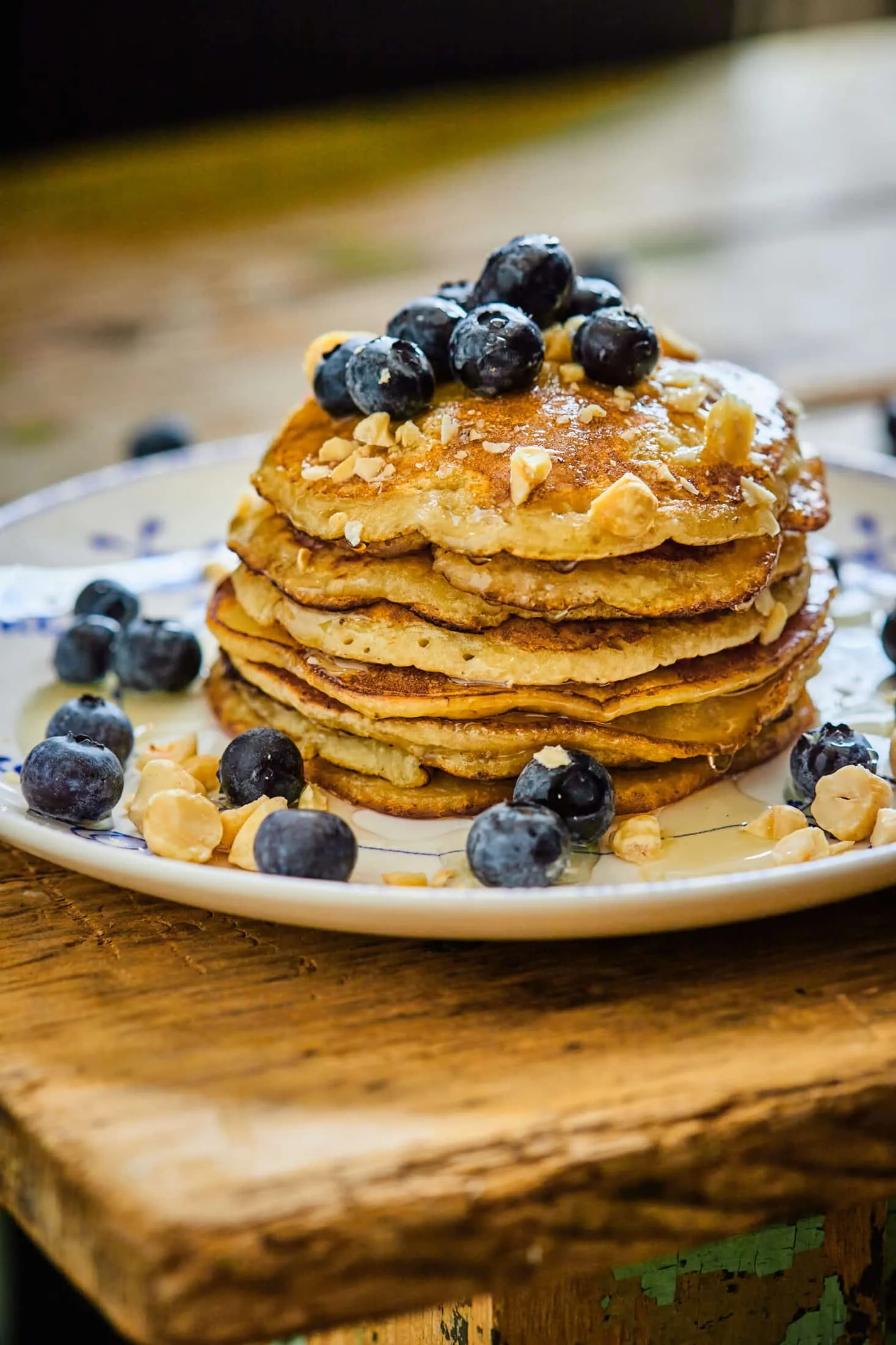 Mikor elkészültek a palacsinták, egymásra halmozzuk őket, meglocsoljuk juharsziruppal, megszórjuk friss áfonyával és tört mogyoróval, és indulhat is a falatozás! :D
