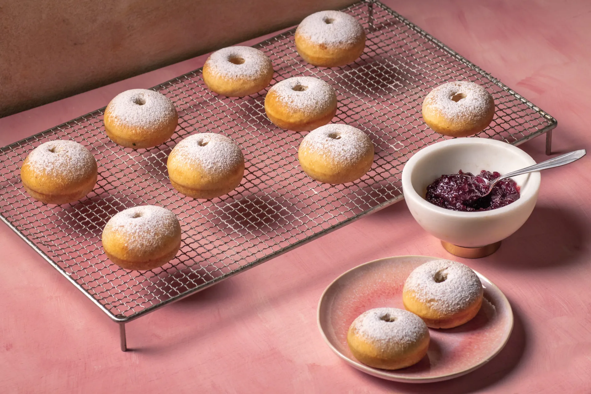 Ezután 18 gombócot formázunk a tésztából, és egy deszkán letakarva hagyjuk állni további 20 percet. A fánksütő formát kikenjük egy kevés olajjal, és belerakjuk a golyókat. 180 fokon kb. fél óra alatt megsütjük. Fahéjas porcukorral vagy pl. lekvárral tálaljuk.