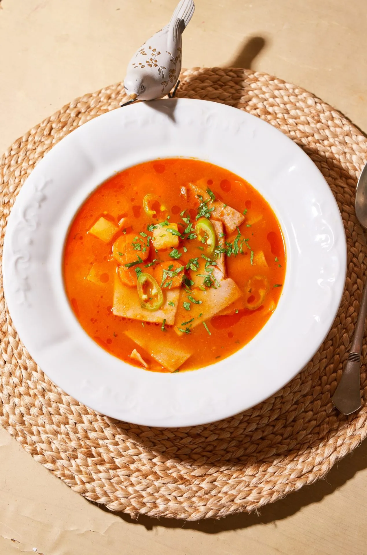 Ha lepirult, megszórjuk a fűszerekkel, beletesszük a sűrített paradicsomot, és enyhén ezt is lepirítjuk, majd felöntjük 2 liter vízzel. Ha minden összetevő megpuhult, összeturmixoljuk, majd beletesszük a felkockázott krumplikat és a felkarikázott sárgarépát, amiket háromnegyedig főzünk, majd a tésztát hozzáadva készre főzzük. Tálaláskor kis friss petrezselymet szórunk rá és meglocsoljuk paprikás olajjal.