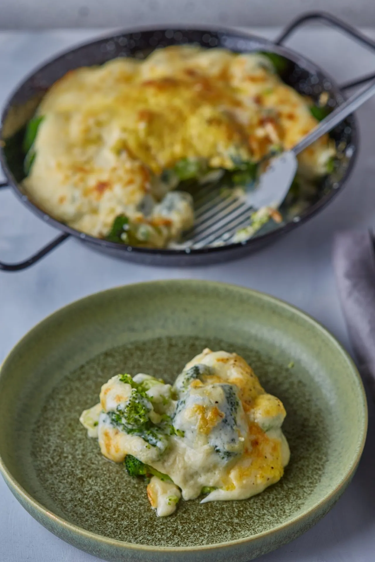 A brokkolikat leszárítjuk, sütőedénybe tesszük, és rákanalazzuk a mártást.
