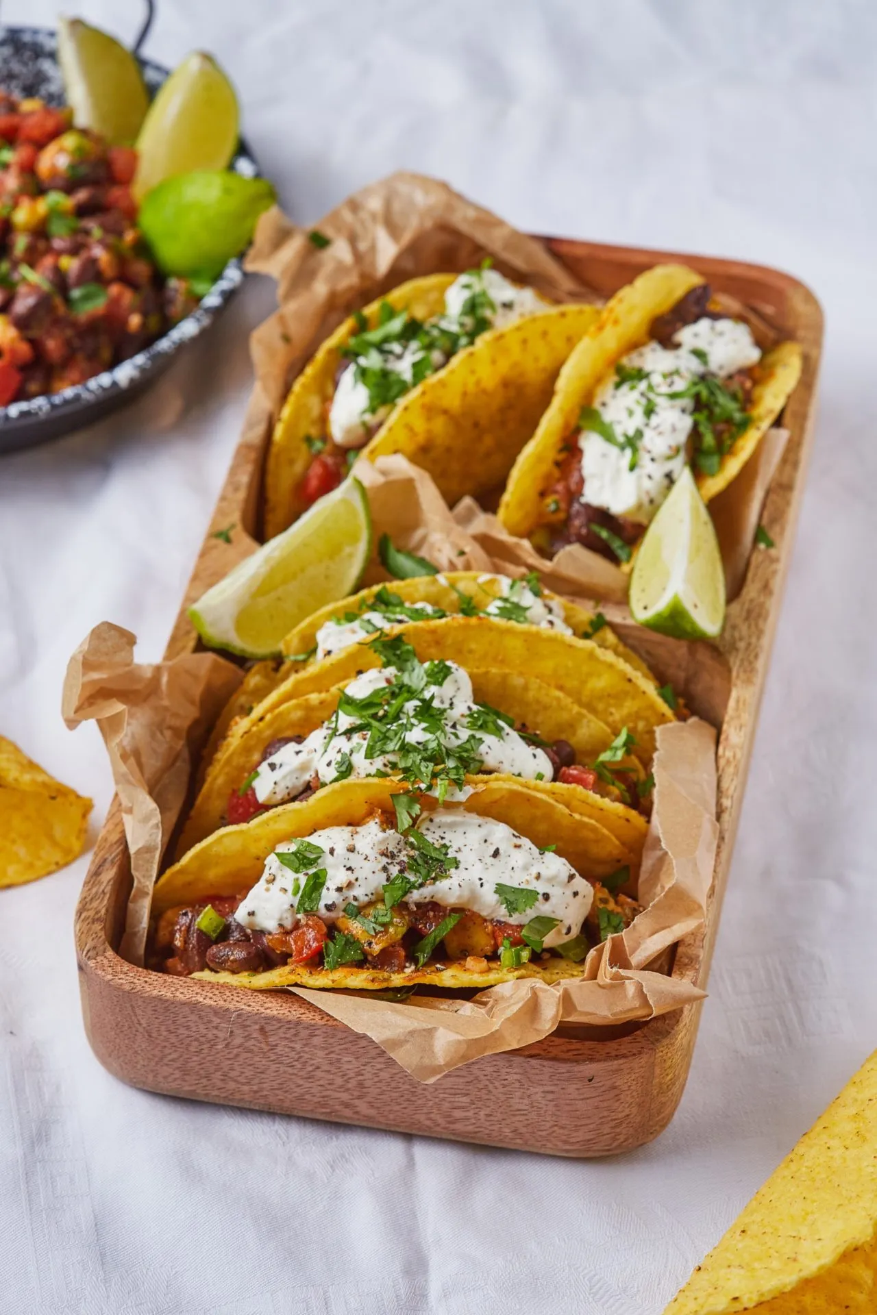A paradicsomoknak kivágjuk a magházát és a csumáját, kisebb kockákra vágjuk a húsát, majd ezt is a babhoz adjuk. Meglocsoljuk egy fél lime levével, a zöldfűszereket pedig durvára vágjuk. A zöldfűszerek nagy részét a babos keverékhez adjuk, és ezzel megtöltjük a tacoshelleket.