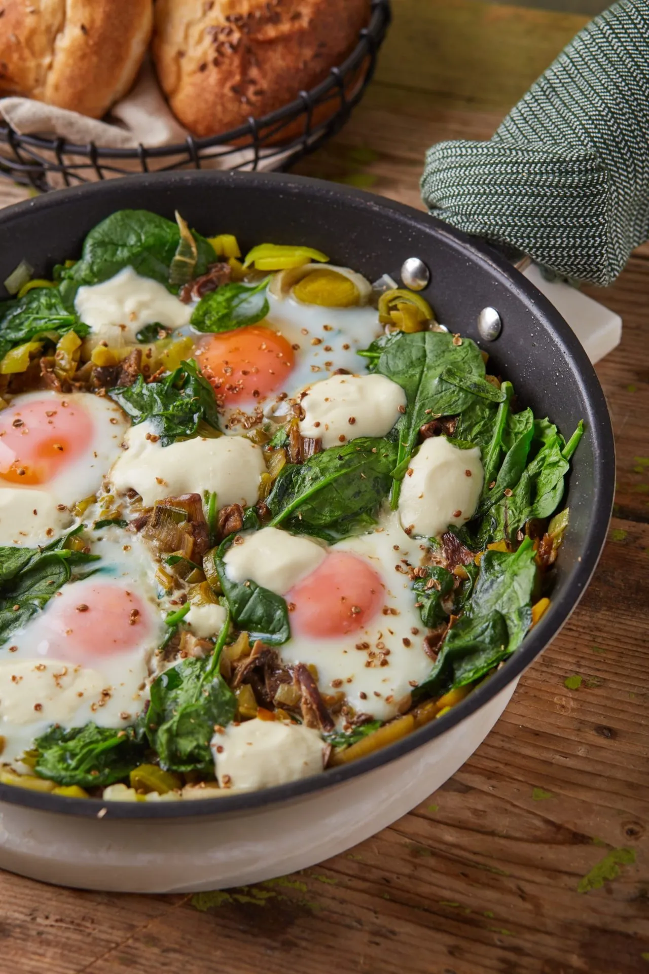 Egy kanállal 6 mélyedést formázunk a keverékben, és mindegyikbe beleütjük egyesével a tojásokat. Nagyobb darabokban belemorzsoljuk a juhtúrót, majd fedő alatt további 5 percig főzzük, amíg a tojások fehérjéje megszilárdul, de a sárgája még folyós marad. Az oregánóval megszórva azonnal tálaljuk.