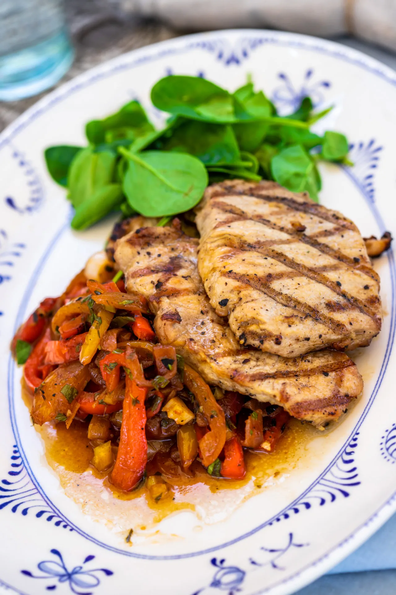 A karajt sózzuk, és a forró grillen 10-15 perc alatt megsütjük, majd egy tálba szedjük, rádobjuk a kockázott vajat, és lefedve hagyjuk 5-10 percig pihenni. A paprikával és bébispenóttal tálaljuk.