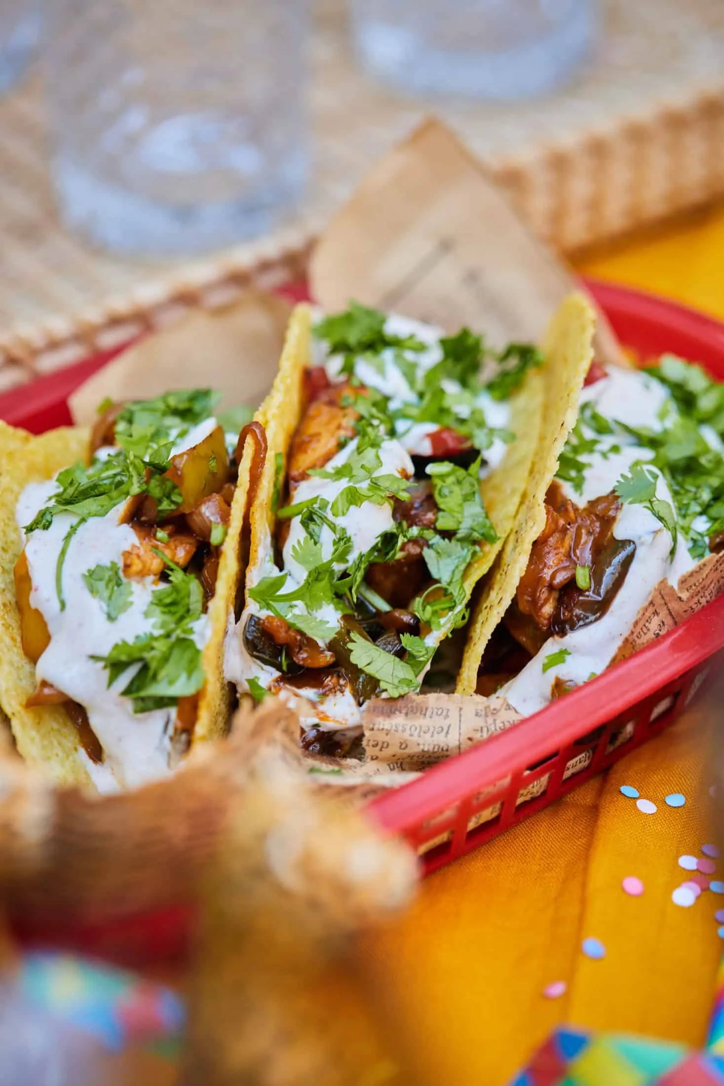 Végül kikeverjük a joghurtos toppingot, majd megtöltjük a tacókat. Mehet bele a húsos vagy tofus töltelék, majd a joghurtos szósz és végül friss koriander. Nincs más hátra, indulhat a buli!