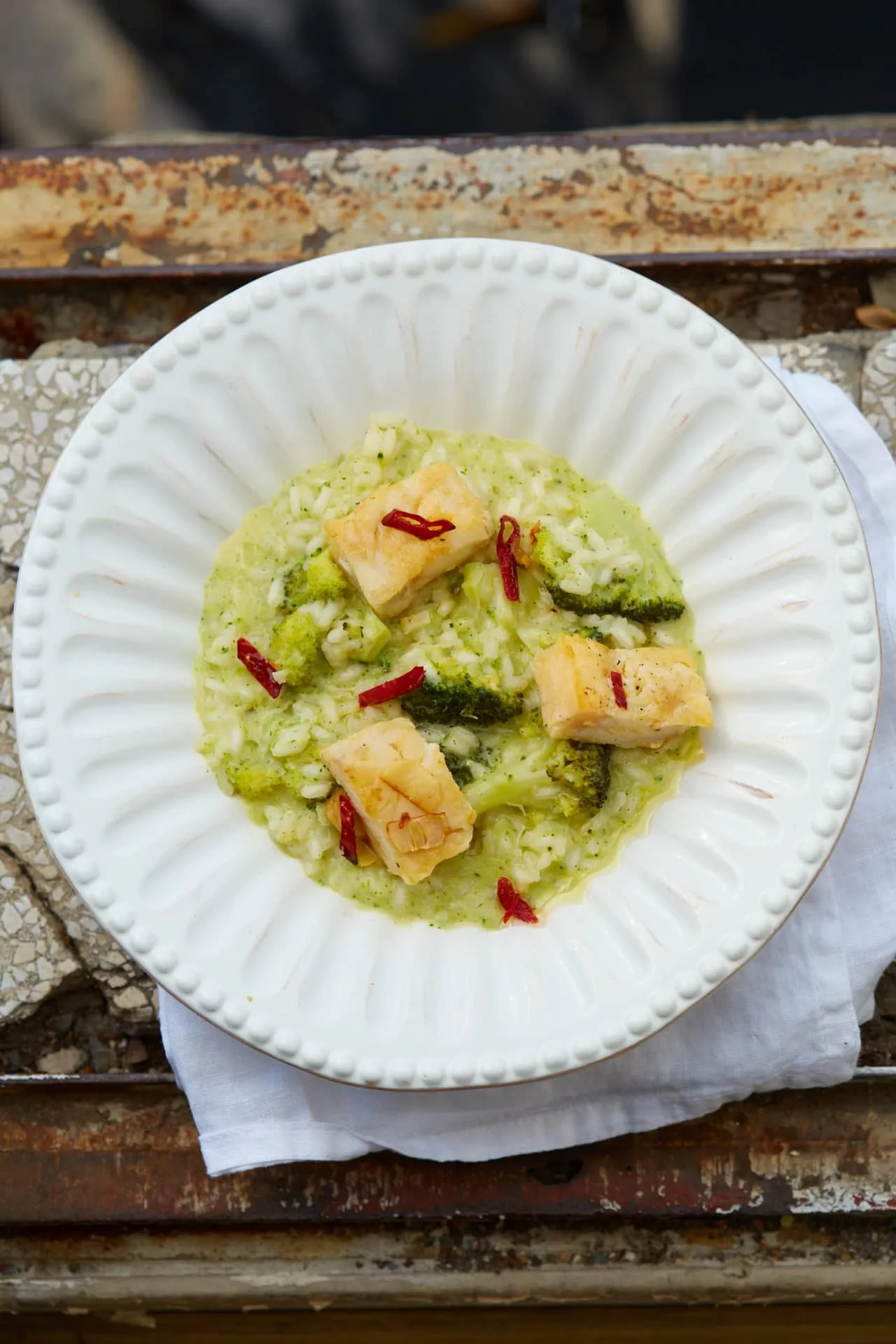 A tőkehalat 2 szeletre vágjuk, sózzuk, borsozzuk. Egy serpenyőben az olívaolajon elkezdjük pirítani a szeletekre vágott chilit. Rádobjuk a felszeletelt fokhagymát, majd a halszeleteket is rátesszük, és oldalanként 3-4 percig sütjük, így nem fog túlsülni. A tőkehalat a brokkolis rizottóval tálaljuk.