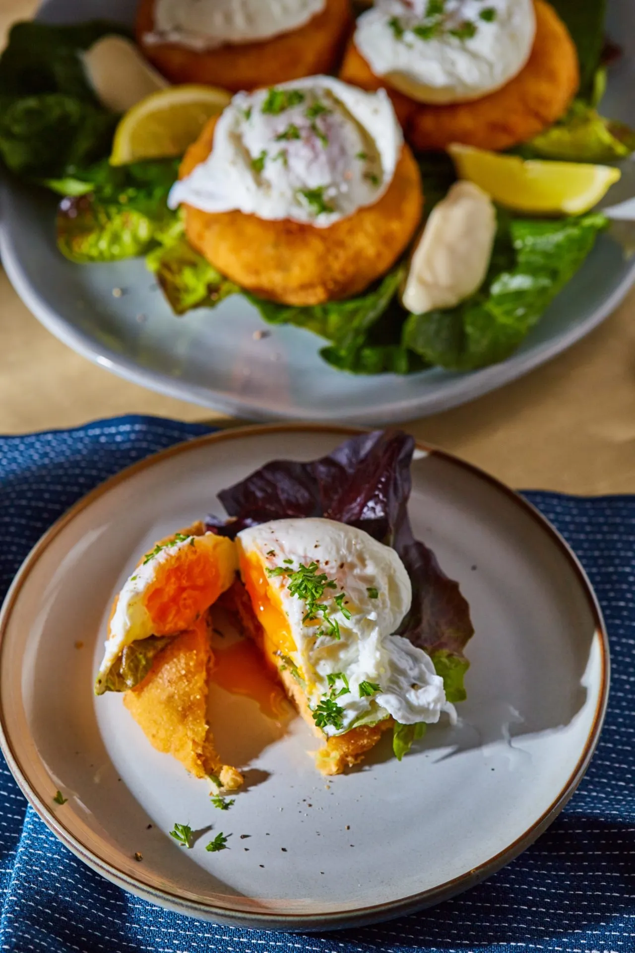 A buggyantott tojáshoz egy lábasban vizet forralunk, amibe a sót és ecetet is beletesszük. Egy öblös merőkanalat beleállítunk a vízbe, majd visszavesszük, hogy csak gyöngyözve forrjon. Ezután a tojásokat egyesével először egy csészébe, majd abból a merőkanálba öntjük. Fehéredésig, 2-3 percig főzzük, majd egy kanállal vagy spatulával kifordítjuk a merőkanálból, és további 2-3 percig főzzük. A kész tojásokat papíron vagy konyharuhán leitatjuk, és a halpogácsa tetejére tálaljuk. Jól illik hozzá bármilyen majonéz alapú vagy citrusos dresszing.