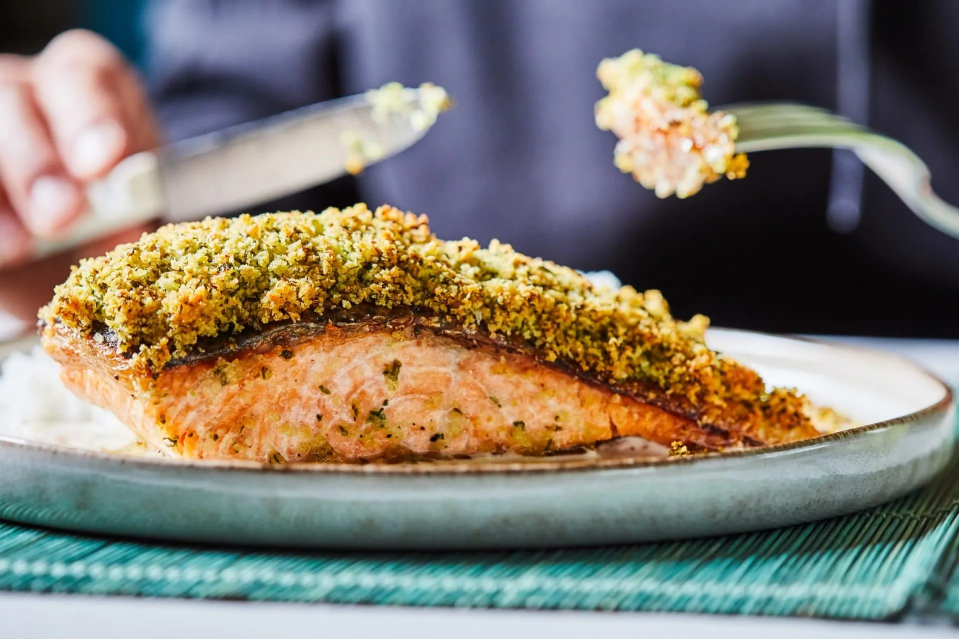 A lazacot sózzuk, borsozzuk és elkezdjük az olívaolajon bőrös oldallal lefelé sütni. Ha jól megpirult a bőre, megfordítjuk, és további 3 percig sütjük, majd egy tepsire rakjuk. Rányomkodjuk a morzsát, és 200 fokra előmelegített sütőben 18-20 perc alatt megsütjük.
