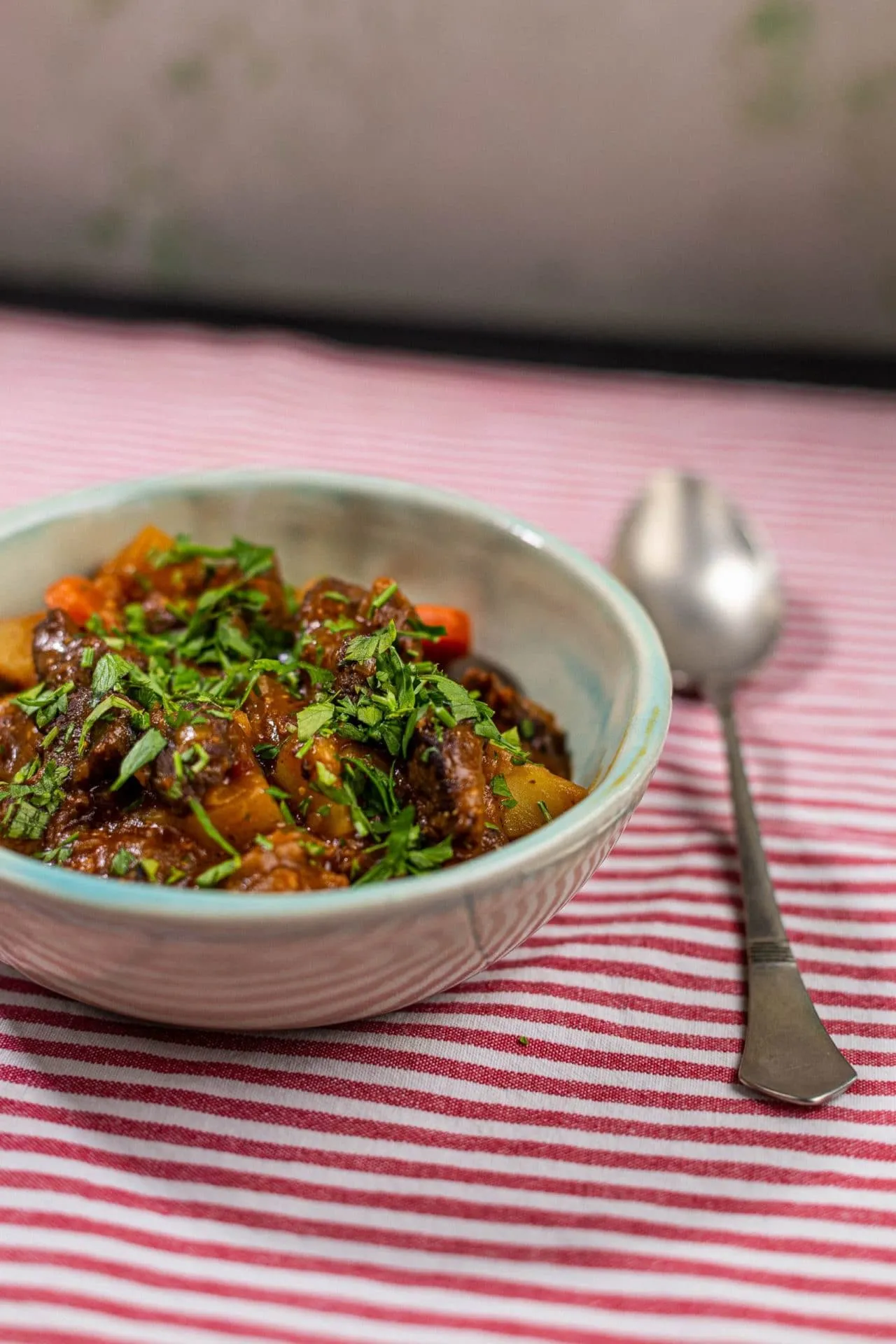 Hozzáadjuk a mustárt és a cukrot, sózzuk, borsozzuk, rádobunk néhány ág kakukkfüvet és a babérlevelet, elkeverjük, felöntjük annyi vízzel, hogy ellepje, majd egy órán keresztül fedő alatt főzzük. Ekkor jöhet bele a felkarikázott répa és póréhagyma, valamint a felkockázott burgonya, és most már fedő nélkül, további 60-90 percig főzzük, vagy amíg a hús meg nem puhul. Ha szükséges, sózzuk és borsozzuk. Apróra vágott petrezselyemmel tálaljuk.