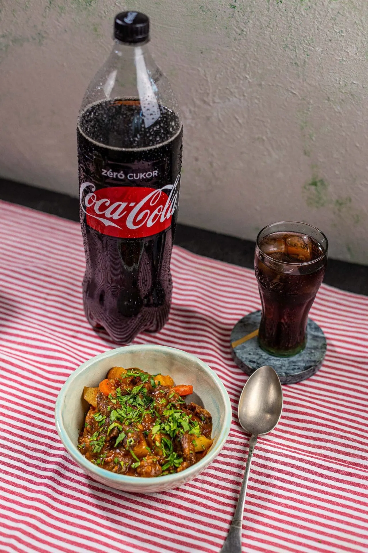 A bacont apróra kockázzuk, zsírjára sütjük egy nagyobb lábosban, majd kiszedjük. A visszamaradt zsíron nagy lángon körbepirítjuk a marhakockákat, majd ezeket is kiszedjük.
