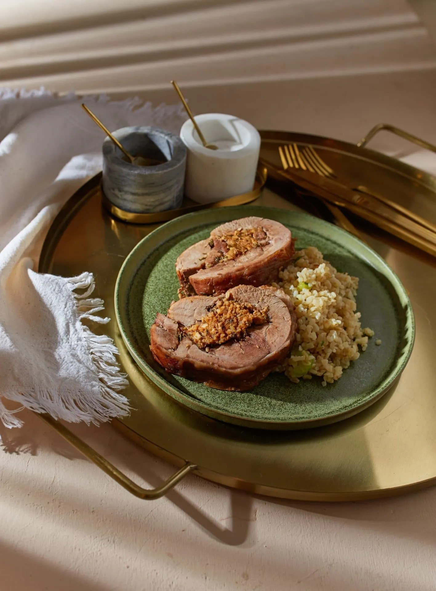 A diót, a fokhagymát és a petrezselymet egy aprítógépbe tesszük, és rusztikus zsemlemorzsa méretűre zúzzuk. A burgonyát mikróba helyezzük puhulásig, majd meghámozzuk, és hagyjuk teljesen kihűlni. A fetát, a burgonyát, a borsot, a füstölt paprikát, a diós mixet és a tojásfehérjét kézzel alaposan összedolgozzuk. Alufóliát terítünk a munkafelületre, ráhelyezzük a kiterített pulykát, sózzuk, borsozzuk, rátépkedjük a kakukkfüvet, majd a töltelékből egy rudat próbálunk formázni, és a hús közepére tesszük. Az alufóliával feltekerjük, mint egy szaloncukrot, majd egy 160 fokos sütőbe tesszük 2 órára.
