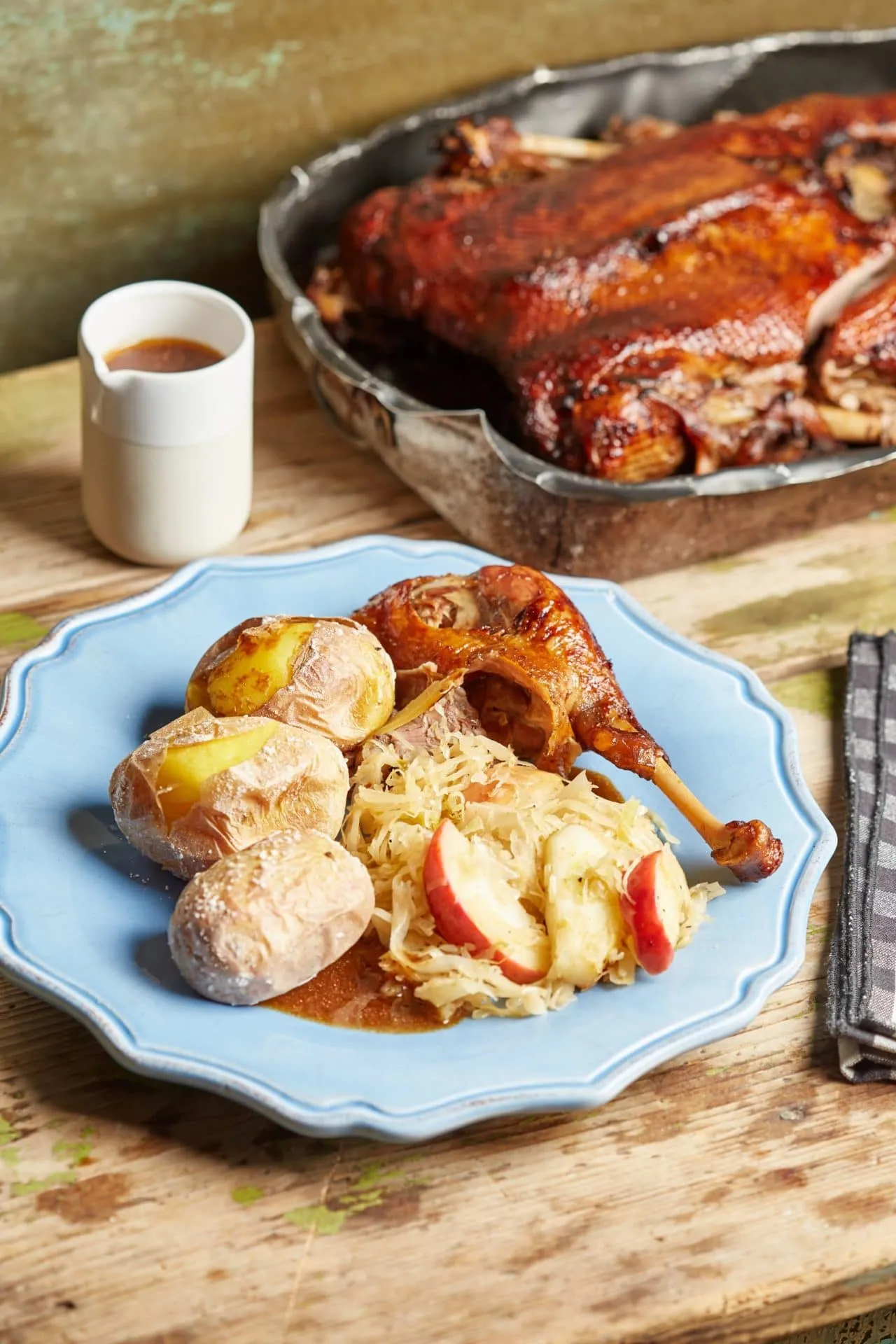 A savanyú káposztát kicsit átmossuk. Egy lábasban cukrot karamellizálunk, hozzáteszünk 100 ml libazsírt (a leszűrt lé tetején nagyon sok zsíros rész keletkezik, ezt használhatjuk hozzá), és rádobjuk a hagymát. Kicsit megpirítjuk, majd hozzáadjuk a káposztát, és fűszerezzük. Fedő alatt megpároljuk és mikor majdnem kész, hozzá rakjuk a kimagozott és felszeletelt almát is. Ízlés szerint tovább édesítjük.